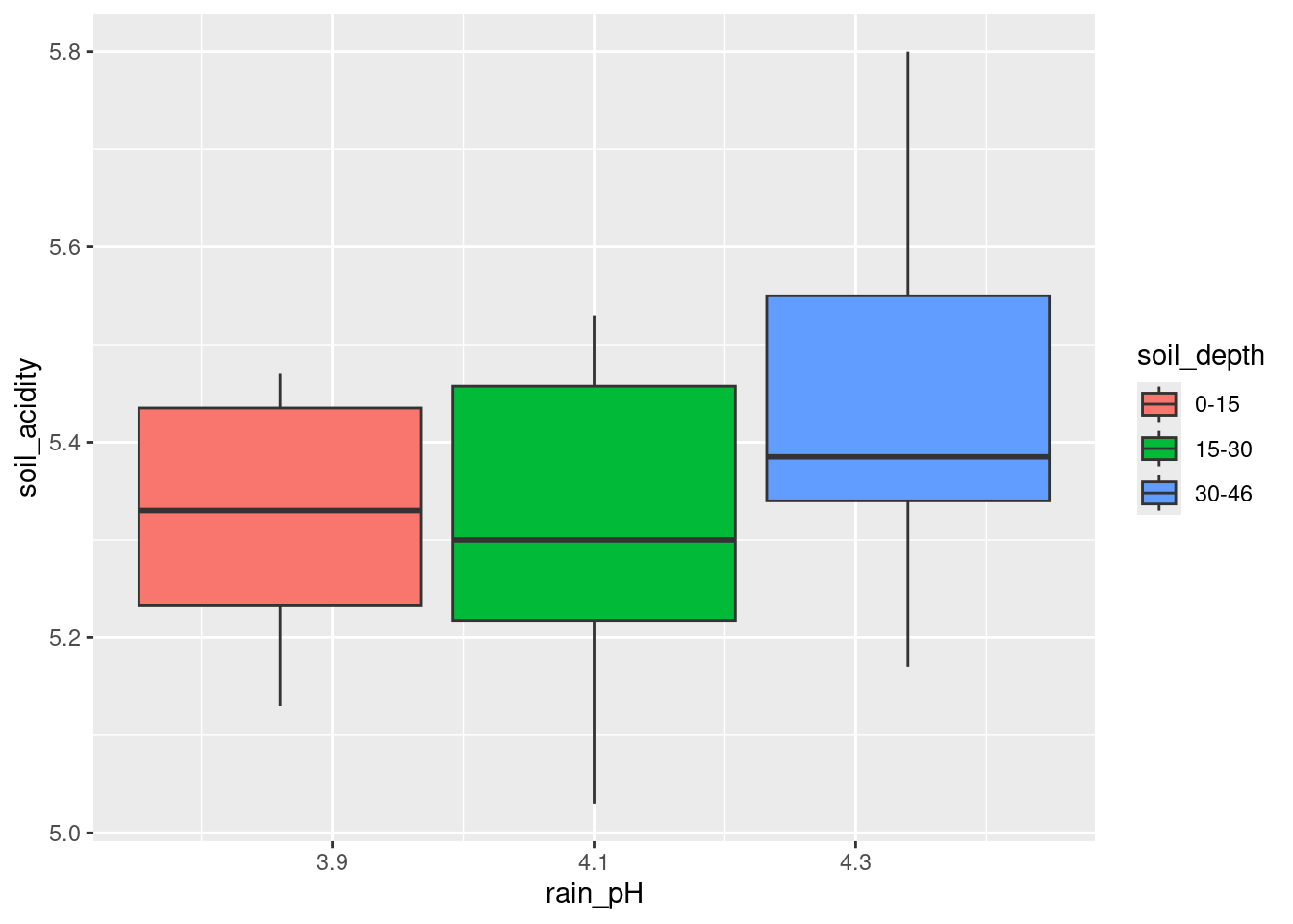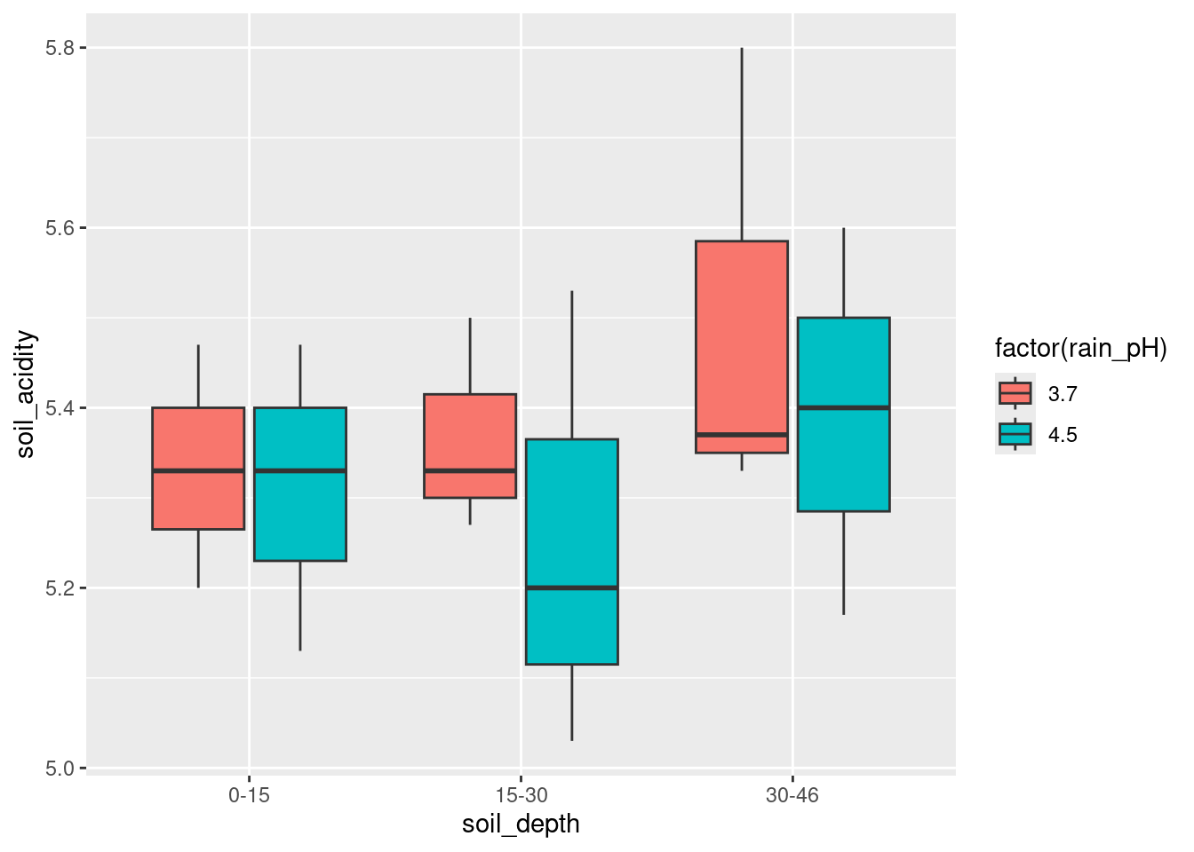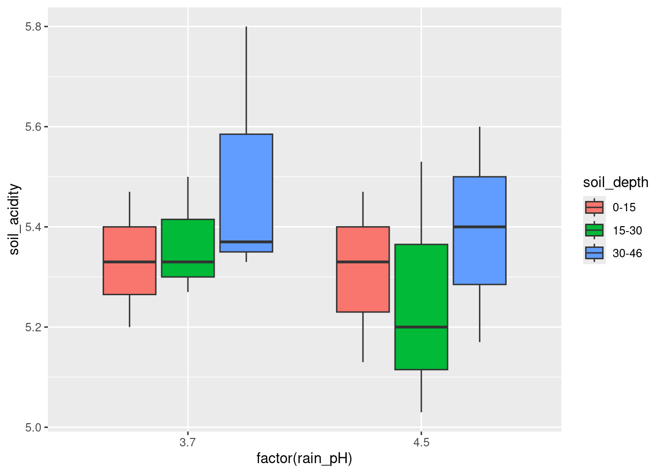 Draw a grouped boxplot to show how soil acidity depends on the pH of the rain and the soil depth. (The first time you do this you might not get the boxplot you want. How can you fix that?)