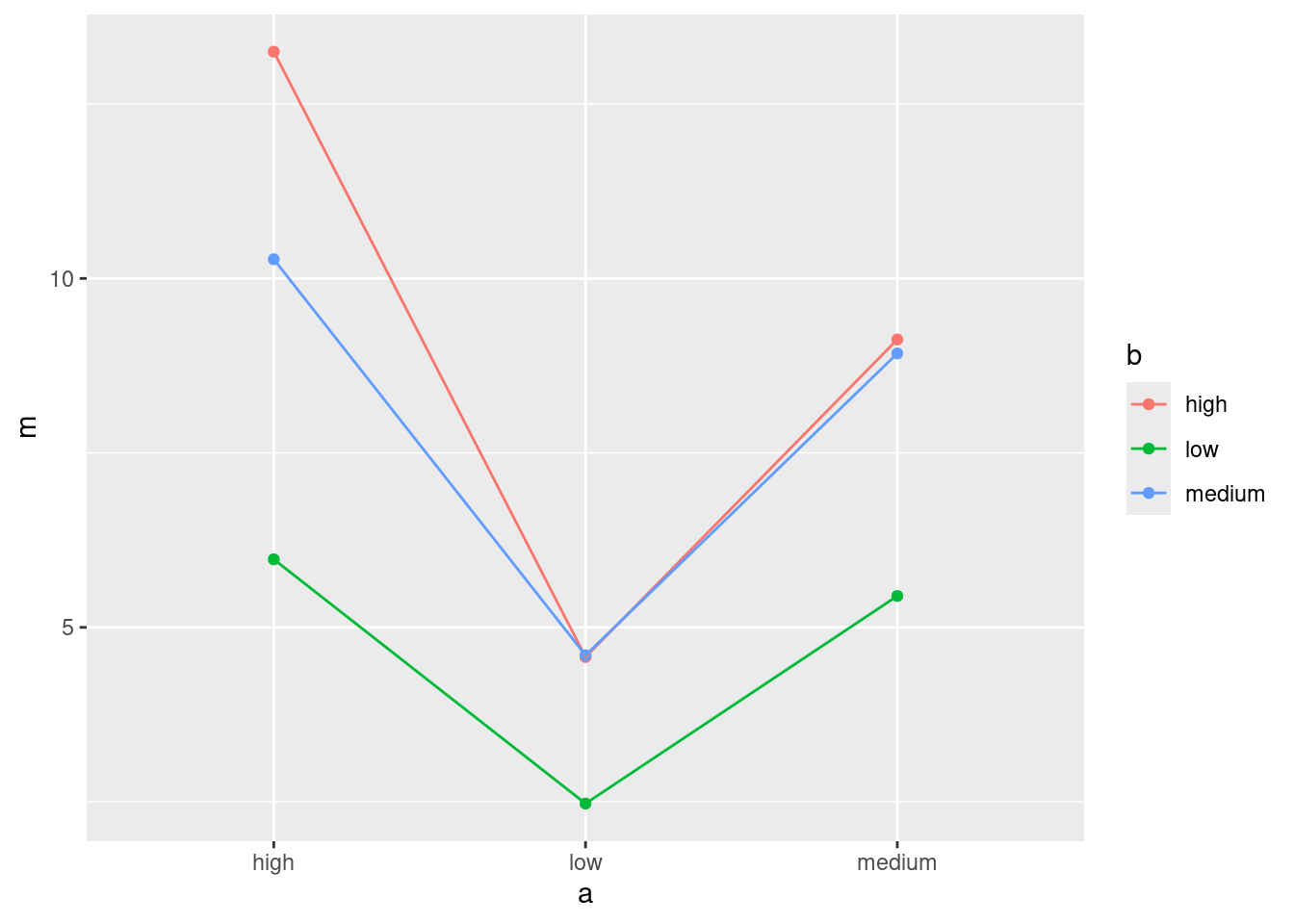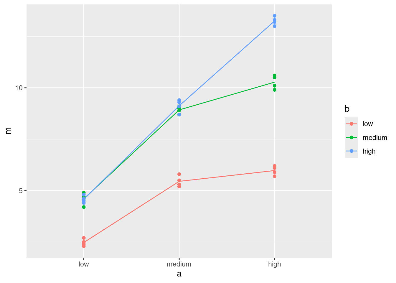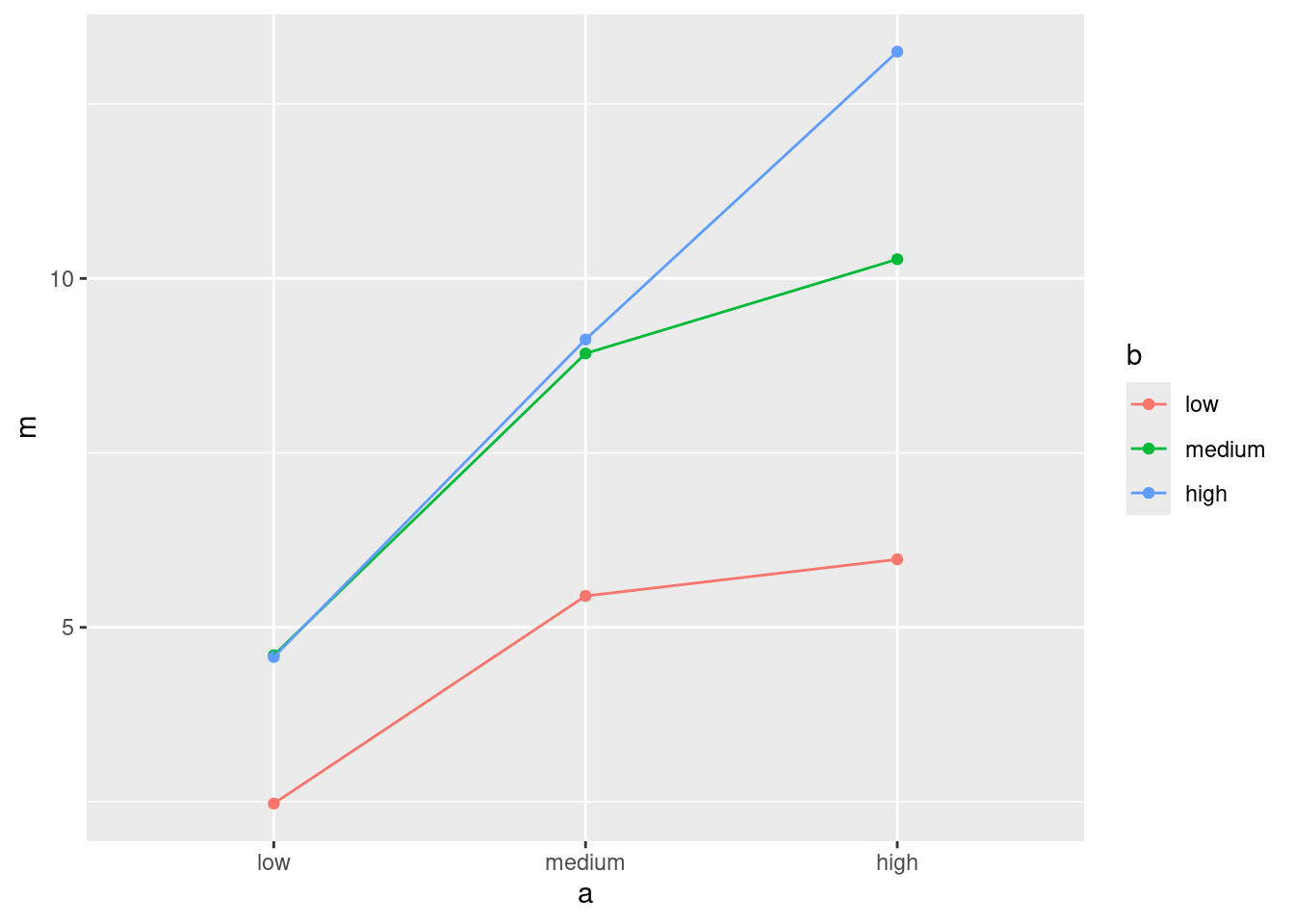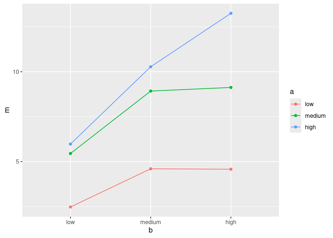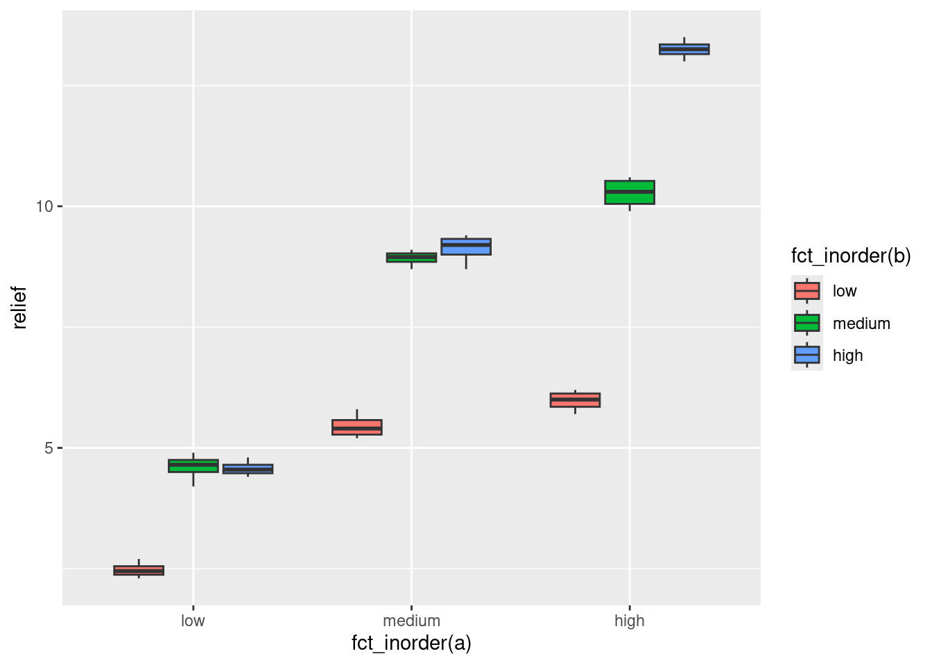 d %>% group_by(trt2) %>% summarize(m = mean(score))Ah, it respects the order of the levels of the factor: that is to say, the treatment groups appear here in the order that they were in the data, because the factor trt2 was created to make that happen.
