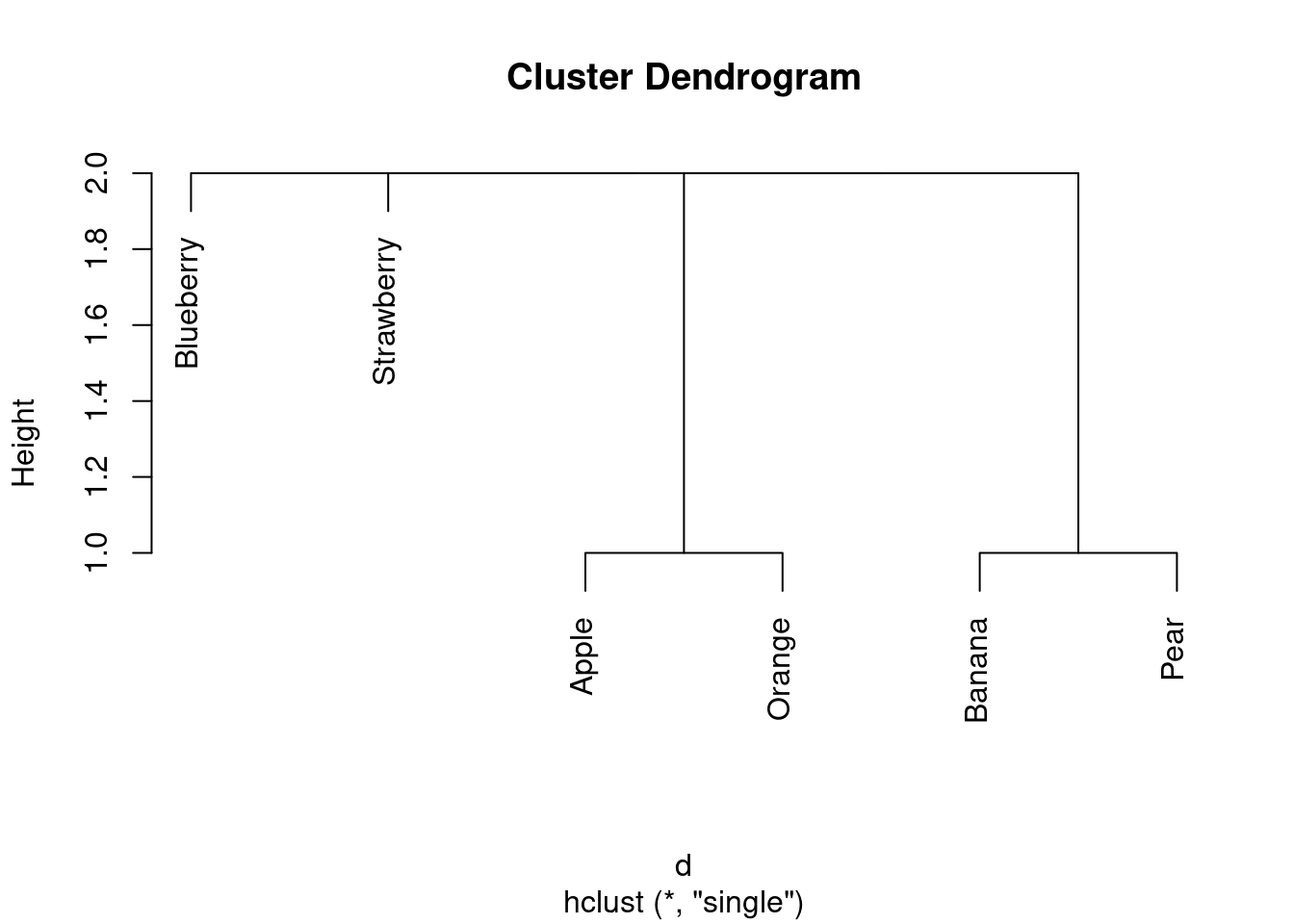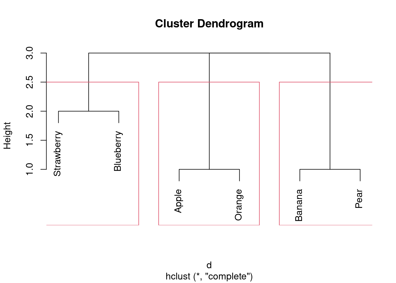 Pick a pair of clusters (with at least 2 fruits in each) from your dendrogram. Verify that the complete-linkage distance on your dendrogram is correct.