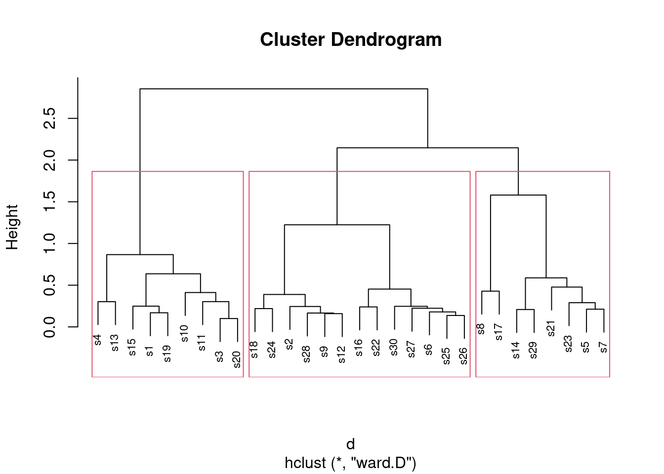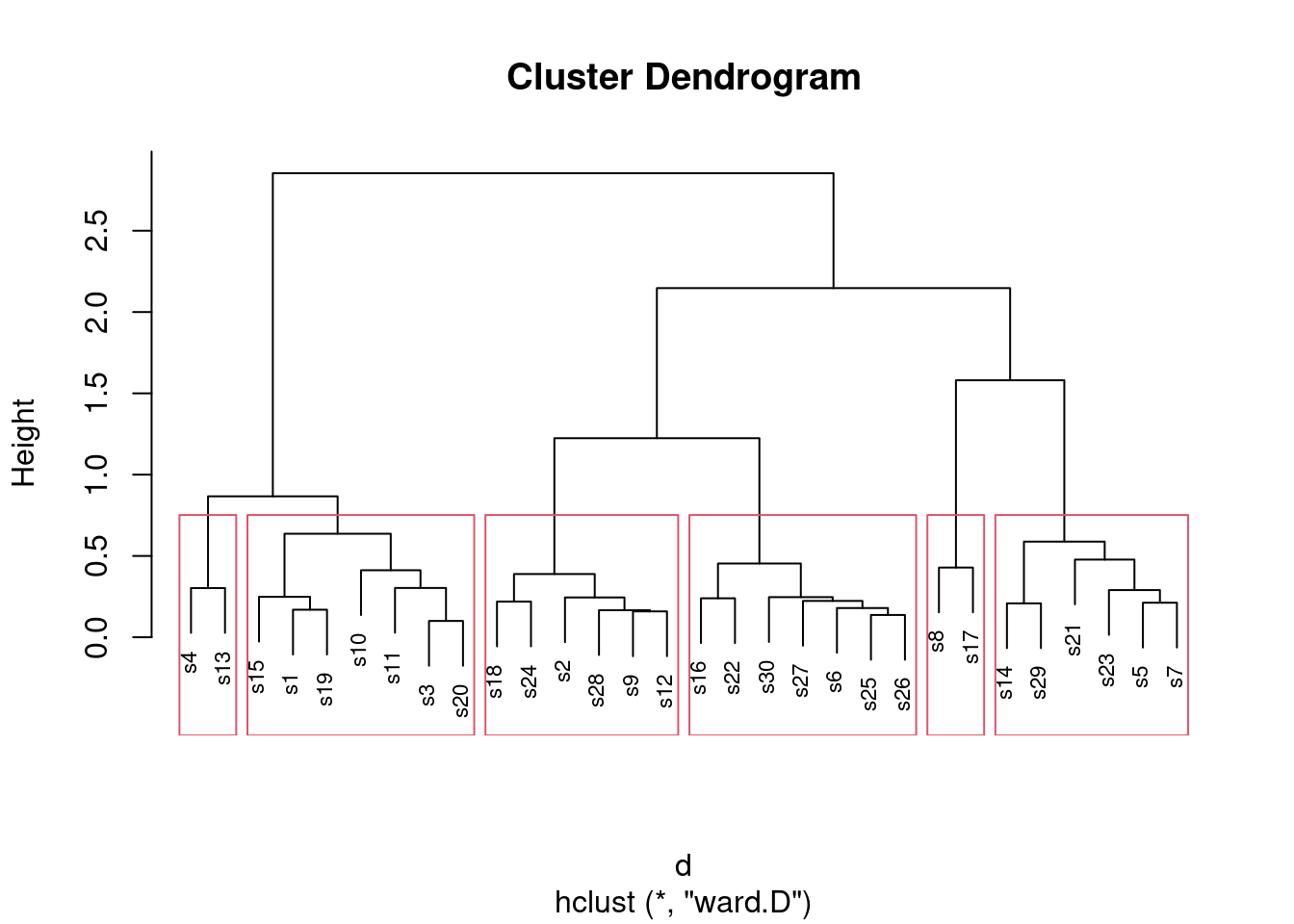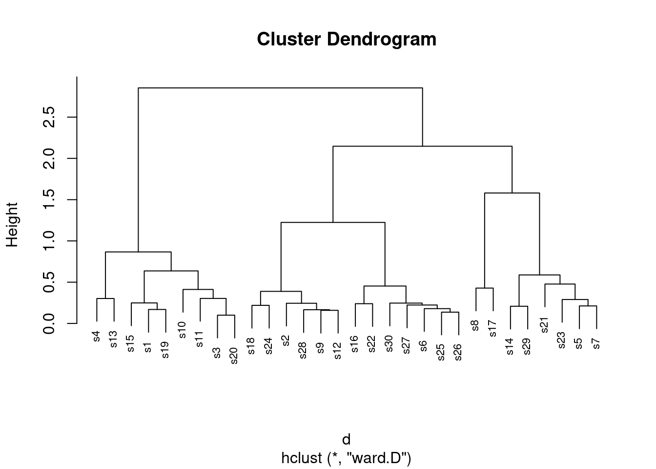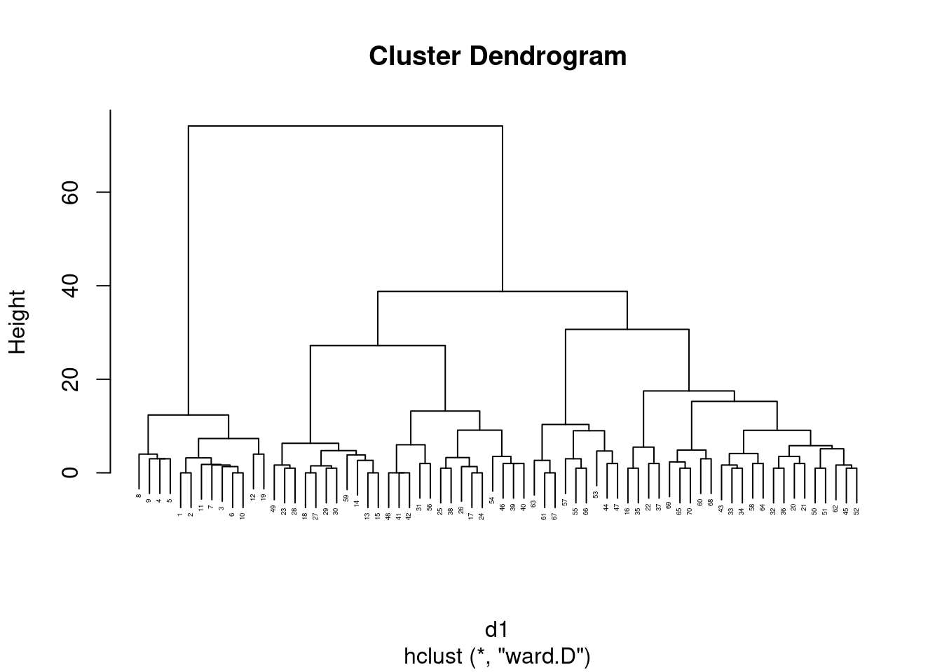 Now fit a cluster analysis using Ward’s method, and display a dendrogram of the results.
