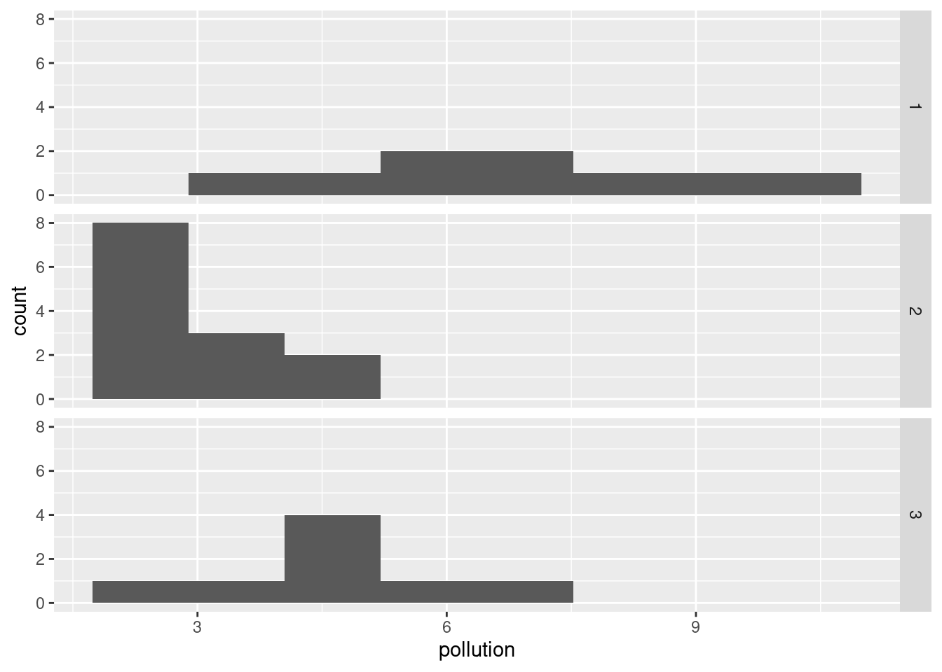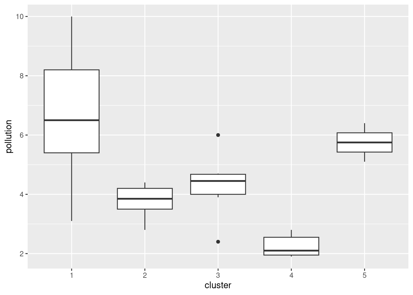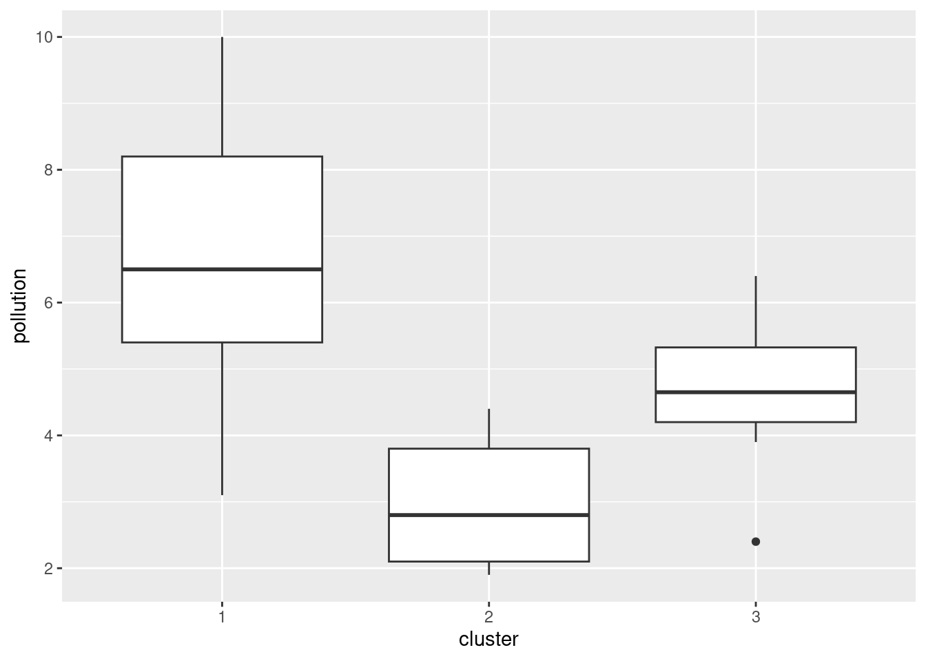 pollution. (Once you have the cluster memberships, you can add them to the data frame and make the graph using a pipe.) What do you see?