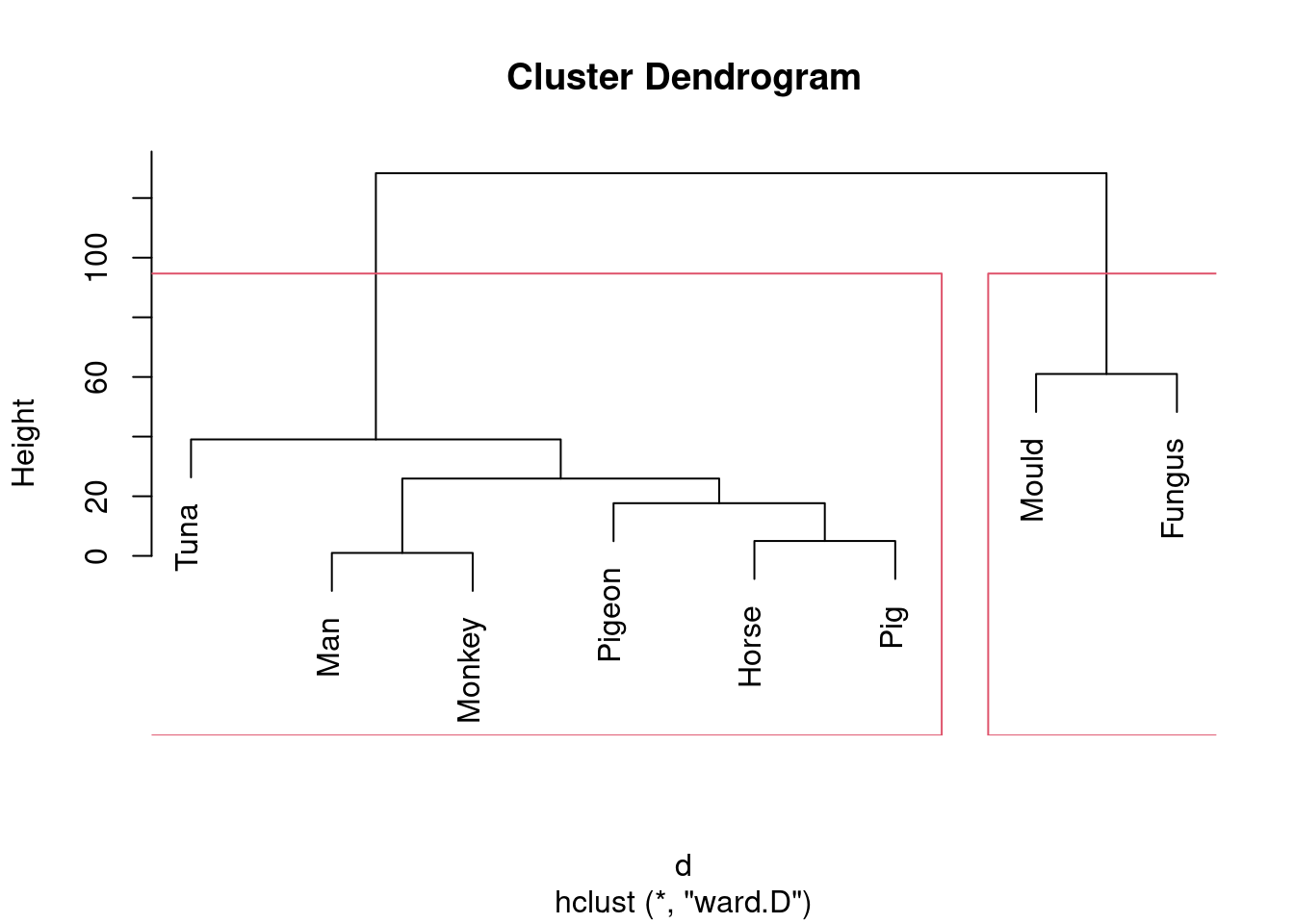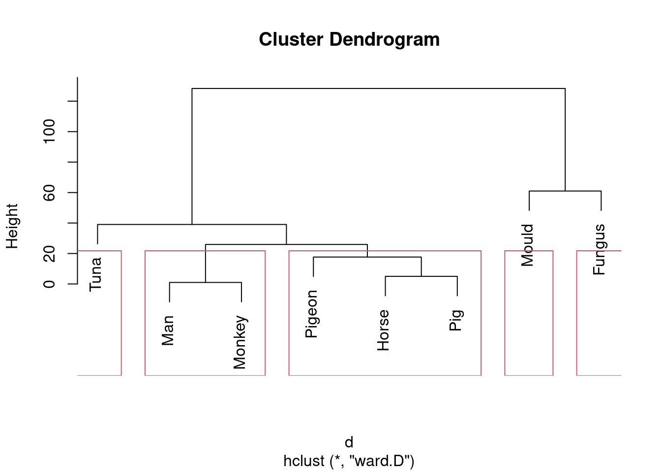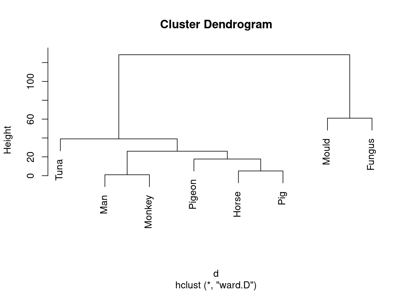 Tuna is an exception, but usually Ward tends to join fairly dissimilar things that are nonetheless more similar to each other than to anything else. This is like Hungarian and Finnish in the example in lecture: they are very dissimilar languages, but they are more similar to each other than to anything else.↩︎