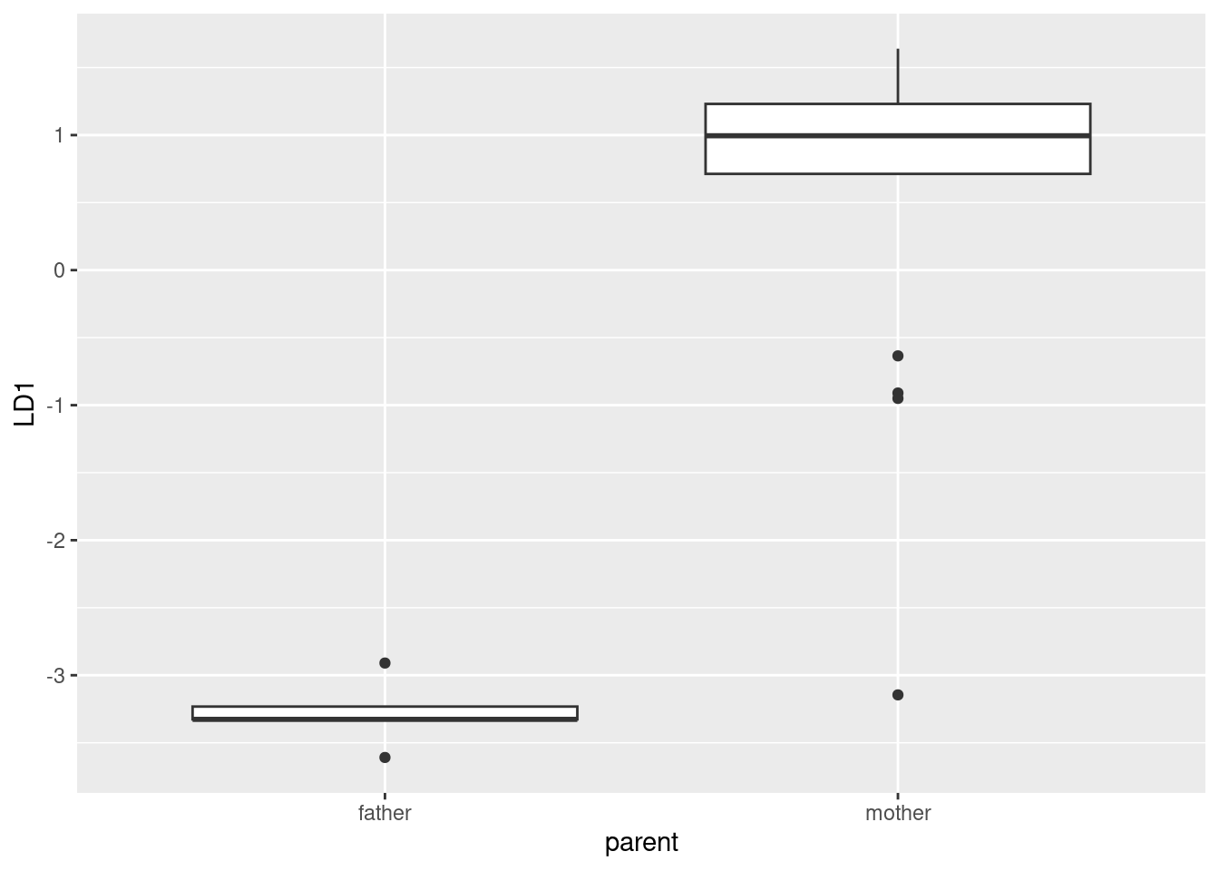 predictbefore, and the ones from the cross-validated analysis. Comment briefly on whether the two sets of posterior probabilities are similar. Hints: (i) usedata.framerather thancbind, for reasons that I explain elsewhere; (ii) round the posterior probabilities to 3 decimals before you display them. There are only 29 rows, so look at them all. I am going to add theLD1scores to my output and sort by that, but you don’t need to. (This is for something I am going to add later.)Row 17 of your (original) data frame above, row 5 of the output in the previous part, is the mother that was misclassified as a father. Why is it that the cross-validated posterior probabilities are 1 and 0, while the previous posterior probabilities are a bit less than 1 and a bit more than 0?