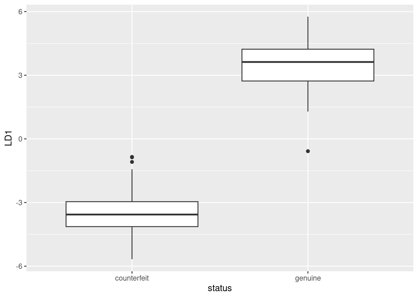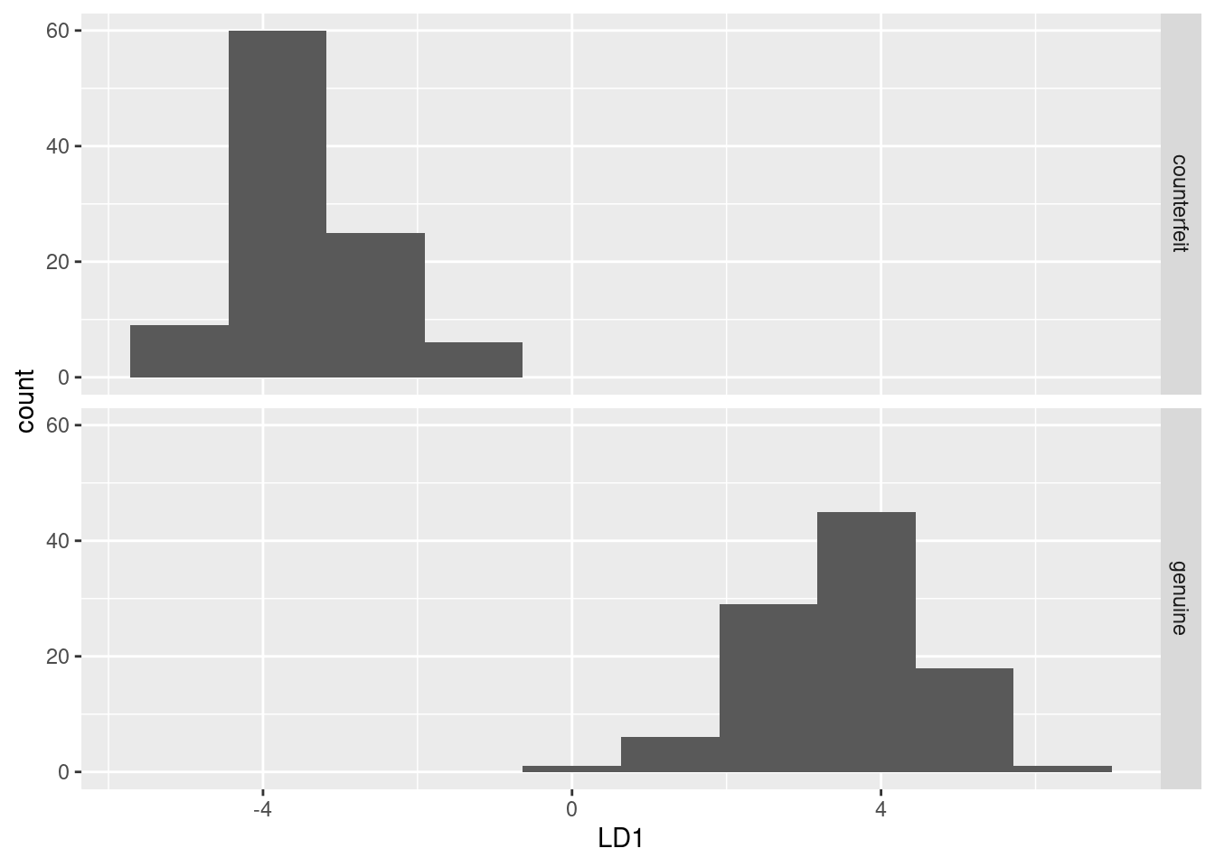 LD1large and positive?* Find the means of each variable for each group (genuine and counterfeit bills). You can get this from your fitted linear discriminant object.