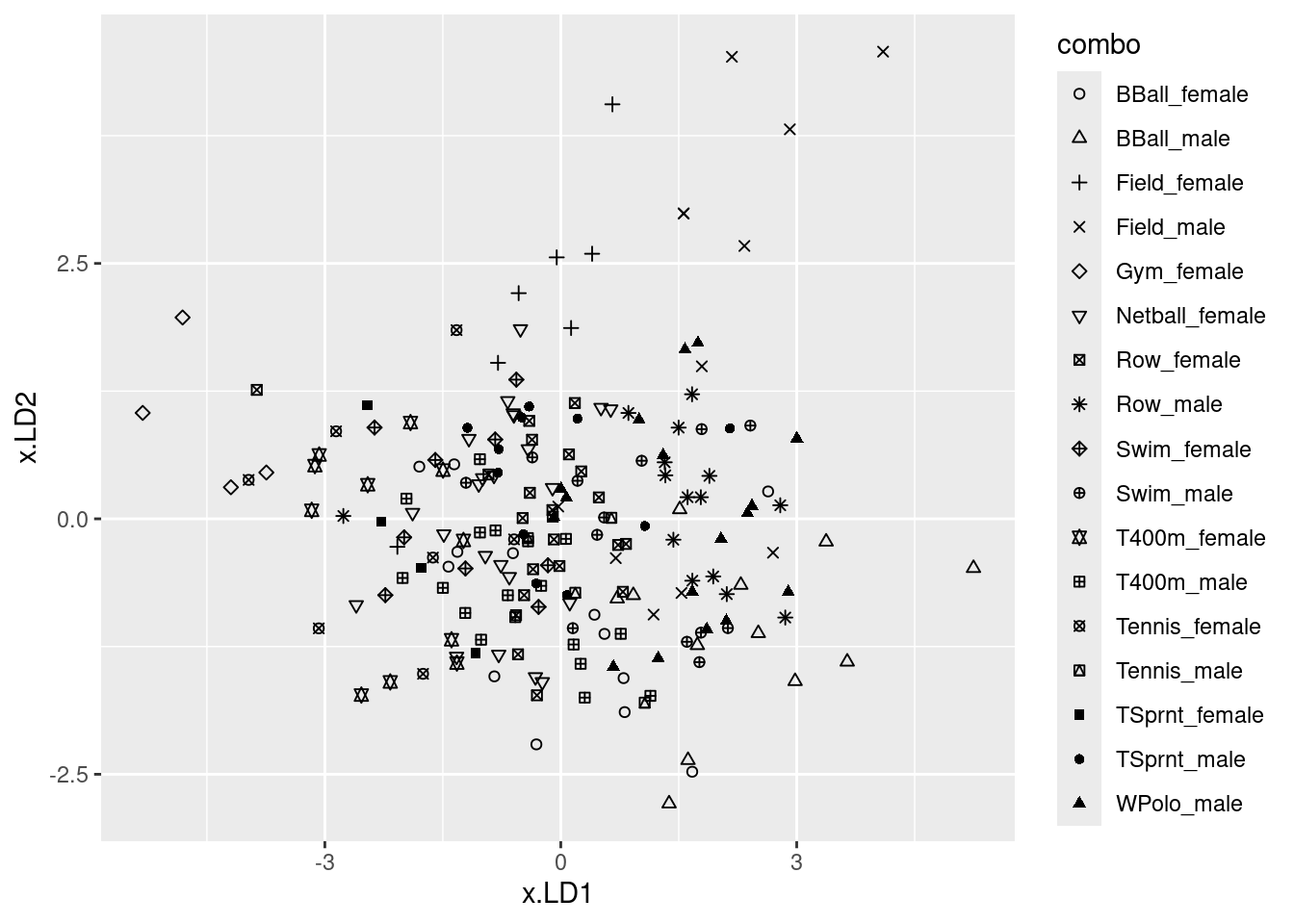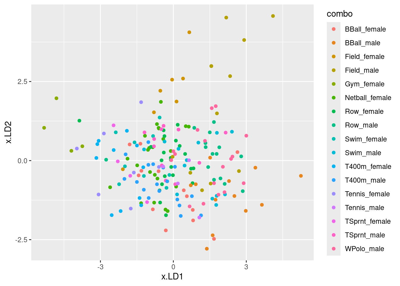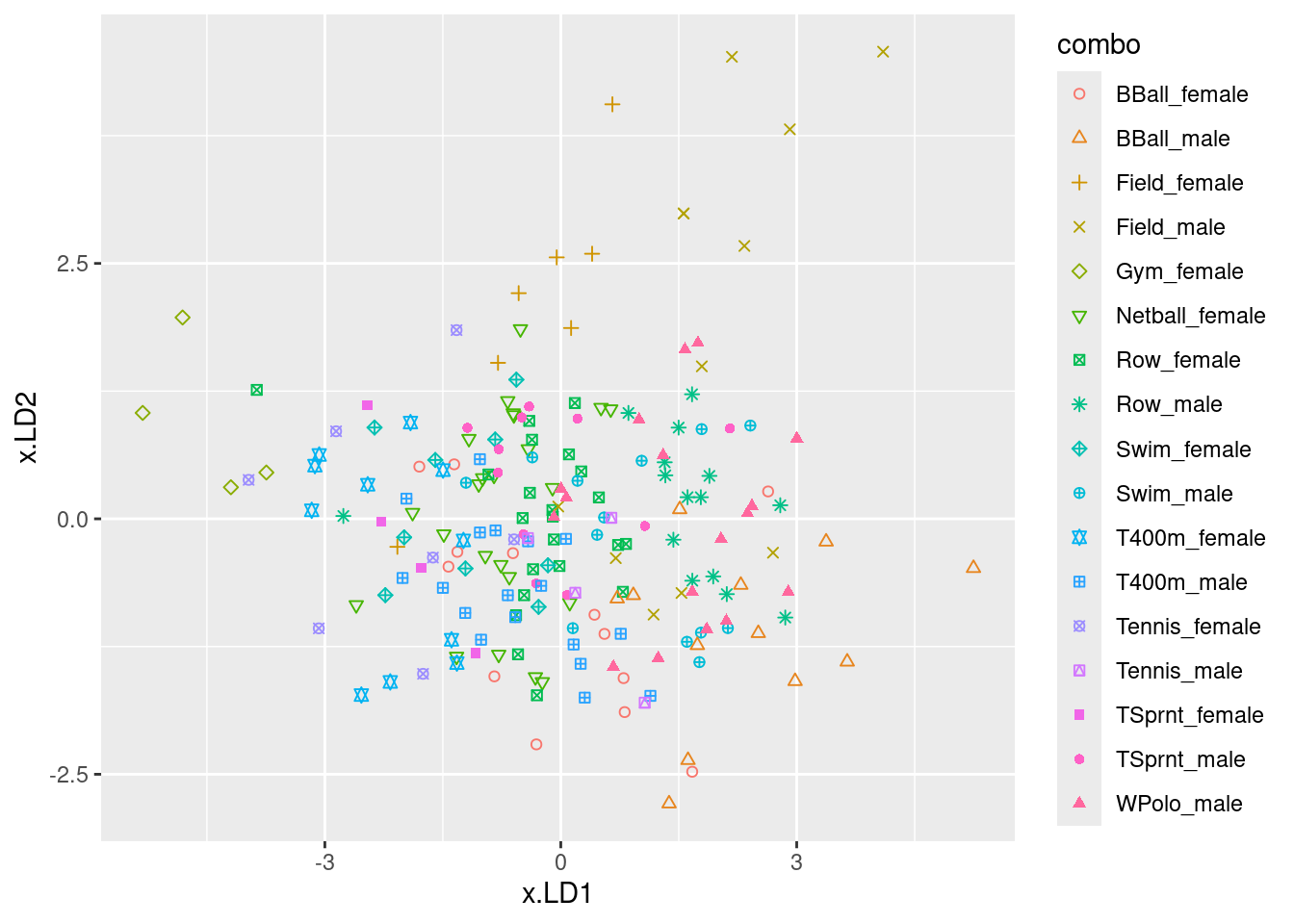 On a previous assignment, we used MANOVA on the athletes data to demonstrate that there was a significant relationship between the combination of the athletes’ height and weight, with the sport they play and the athlete’s gender. The problem with MANOVA is that it doesn’t give any information about the kind of relationship. To understand that, we need to do discriminant analysis, which is the purpose of this question.