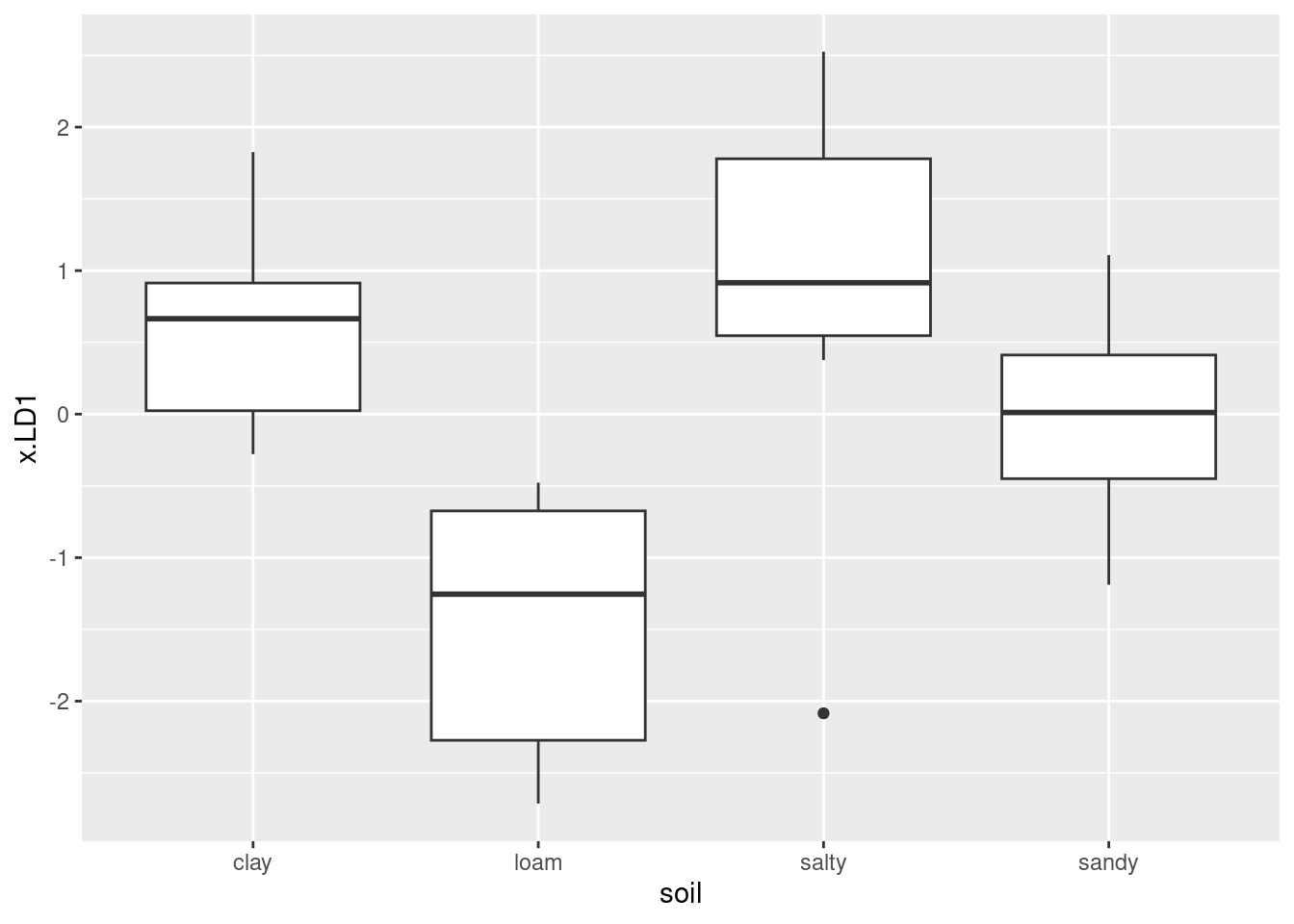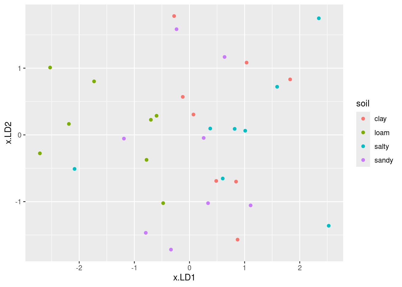 Plot the first two discriminant scores against each other, coloured by soil type. You’ll have to start by making a data frame containing what you need.