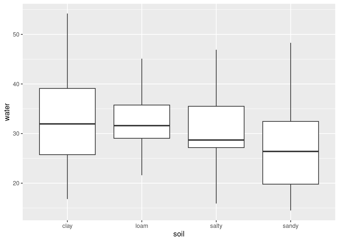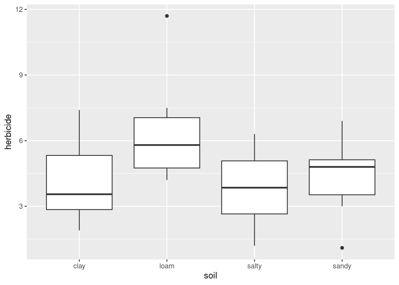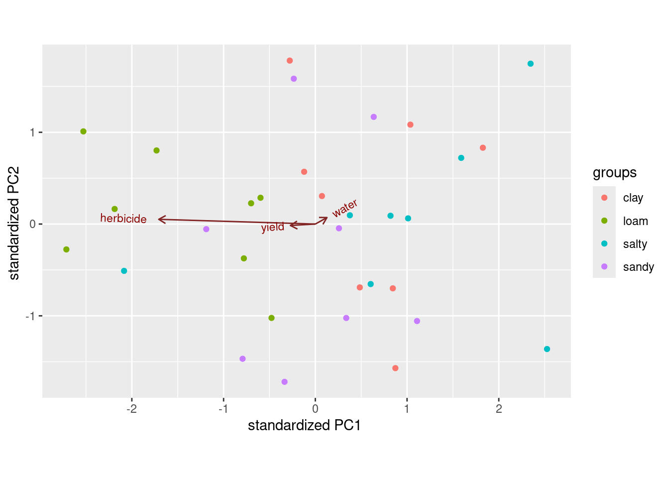A new type of corn seed has been developed. The people developing it want to know if the type of soil the seed is planted in has an impact on how well the seed performs, and if so, what kind of impact. Three outcome measures were used: the yield of corn produced (from a fixed amount of seed), the amount of water needed, and the amount of herbicide needed. The data are in link. 32 fields were planted with the seed, 8 fields with each soil type.