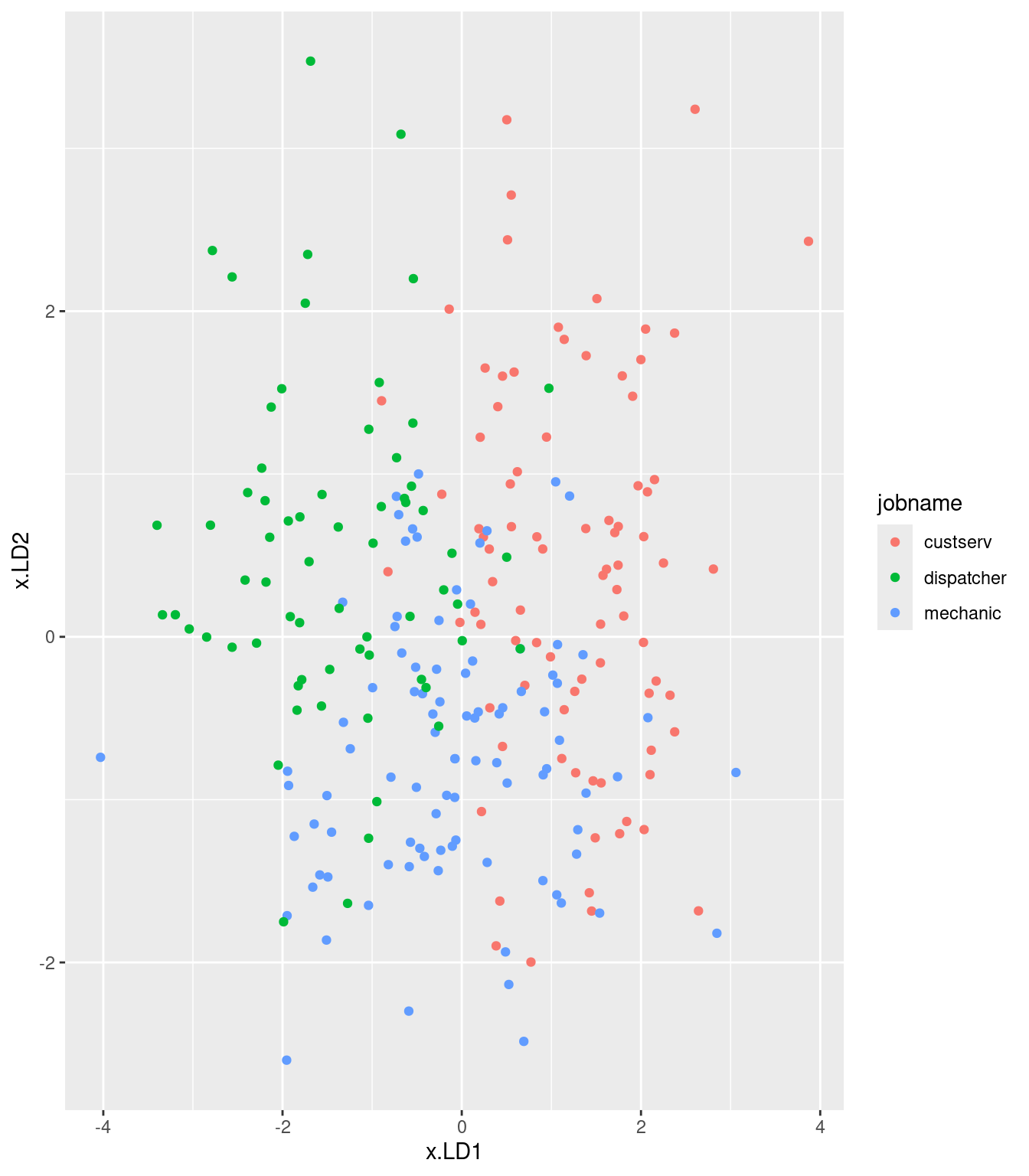 LD1andLD2. The job names are rather long, and there are a lot of individuals, so it is probably best to plot the scores as coloured circles with a legend saying which colour goes with which job (rather than labelling each individual with the job they have).* Obtain predicted job allocations for each individual (based on their scores on the three scales), and tabulate the true jobs against the predicted jobs. How would you describe the quality of the classification? Is that in line with what the plot would suggest?