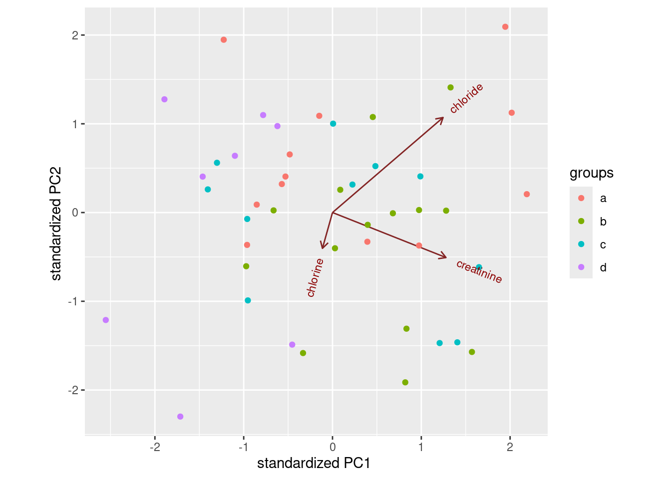 A study was made of the characteristics of urine of young men. The men were classified into four groups based on their degree of obesity. (The groups are labelled a, b, c, d.) Four variables were measured, x (which you can ignore), pigment creatinine, chloride and chlorine. The data are in link as a .csv file. There are 45 men altogether.