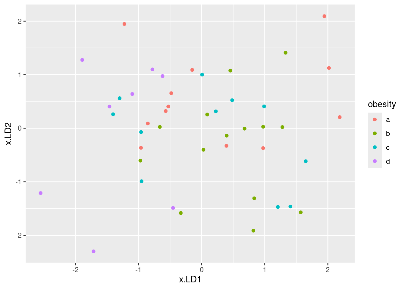 Plot the first two linear discriminant scores (against each other), with each obesity group being a different colour.