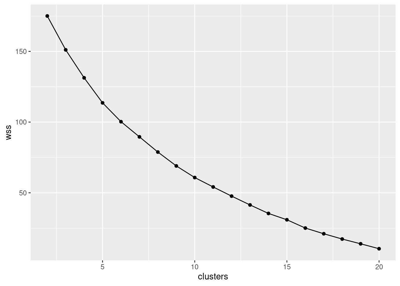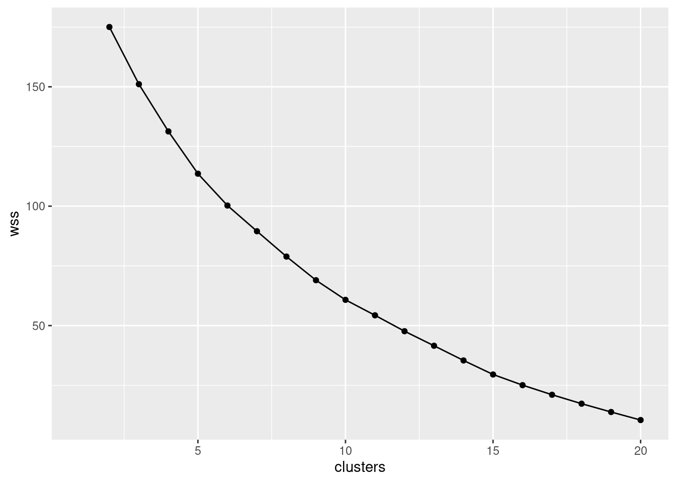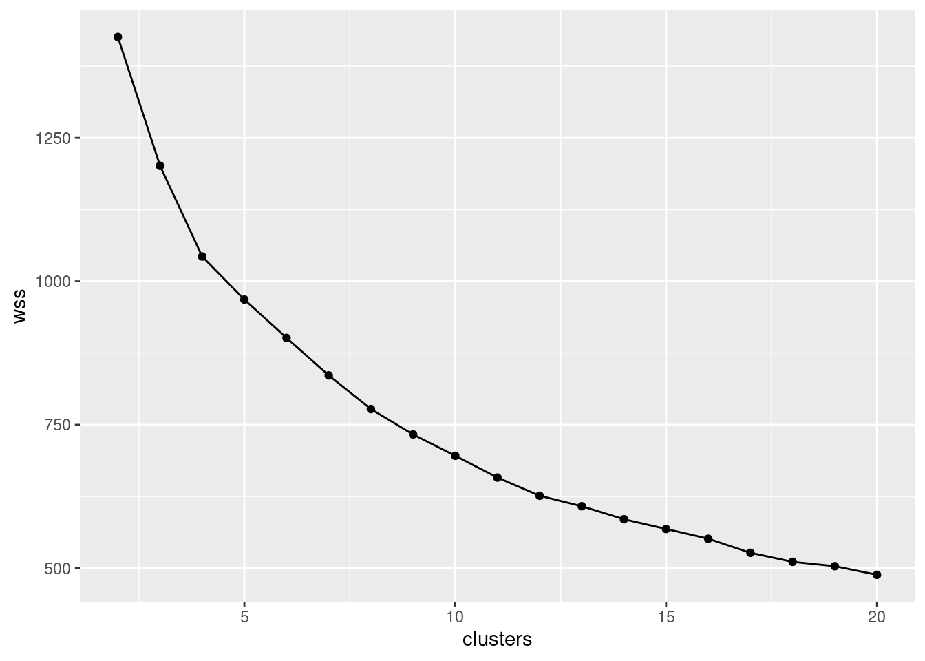 Make a data frame that contains the total within-cluster sum of squares from a K-means clustering for each number of clusters from 2 to 20.