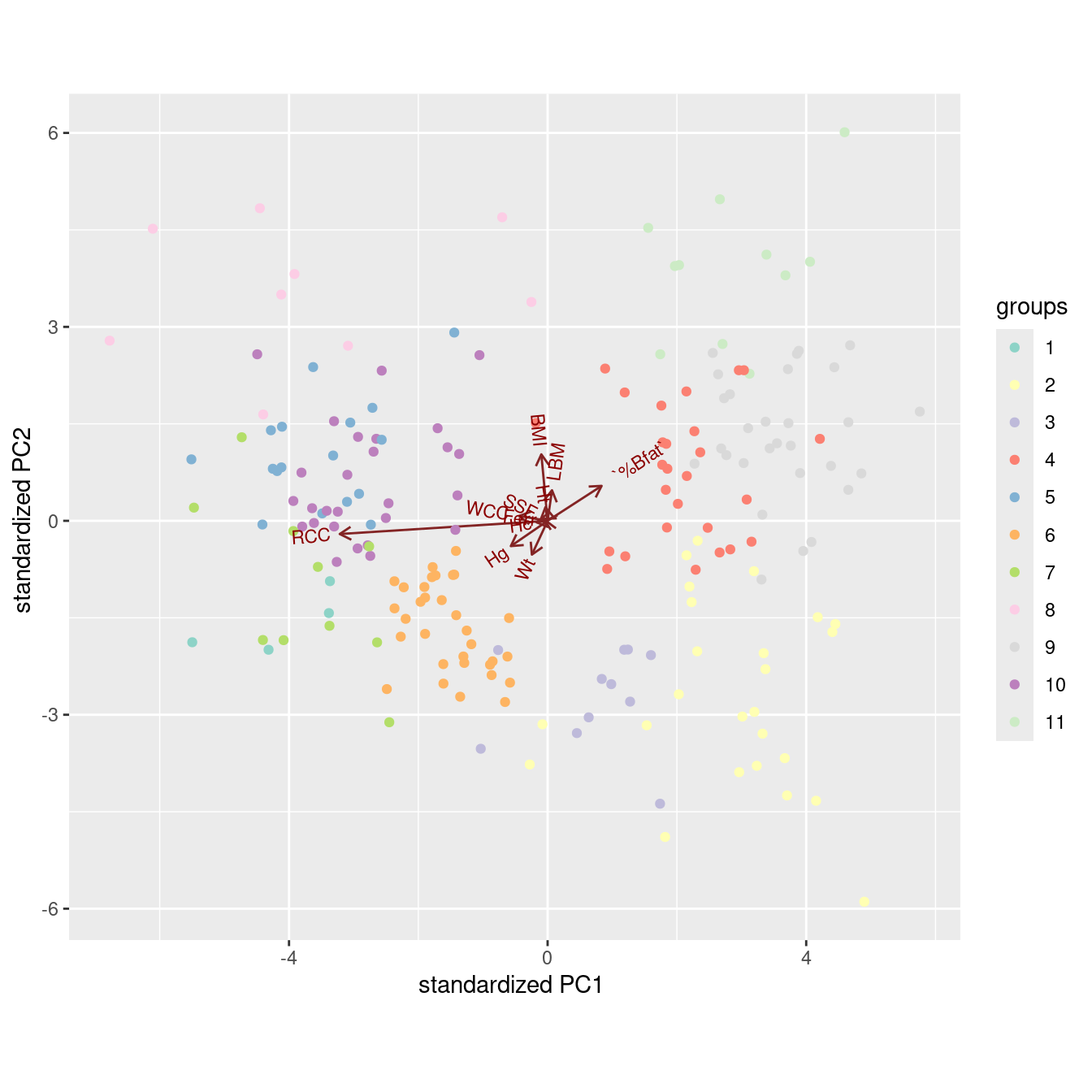 Recall the Australian athlete data (that we’ve seen so many times before). This time, we’ll do some K-means clustering, and then see whether athletes of certain genders and certain sports tend to end up in the same cluster.