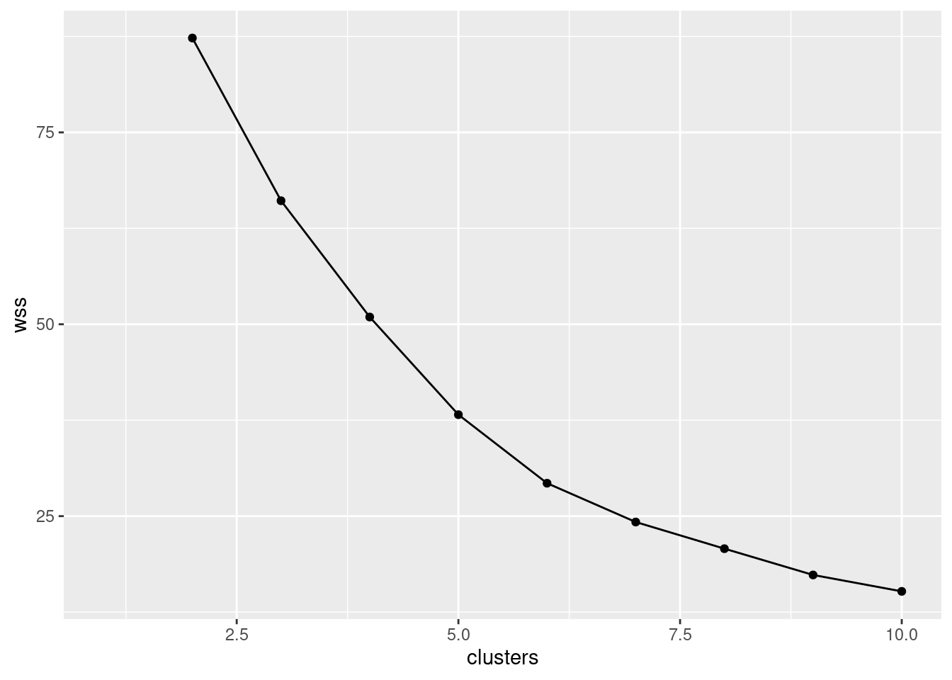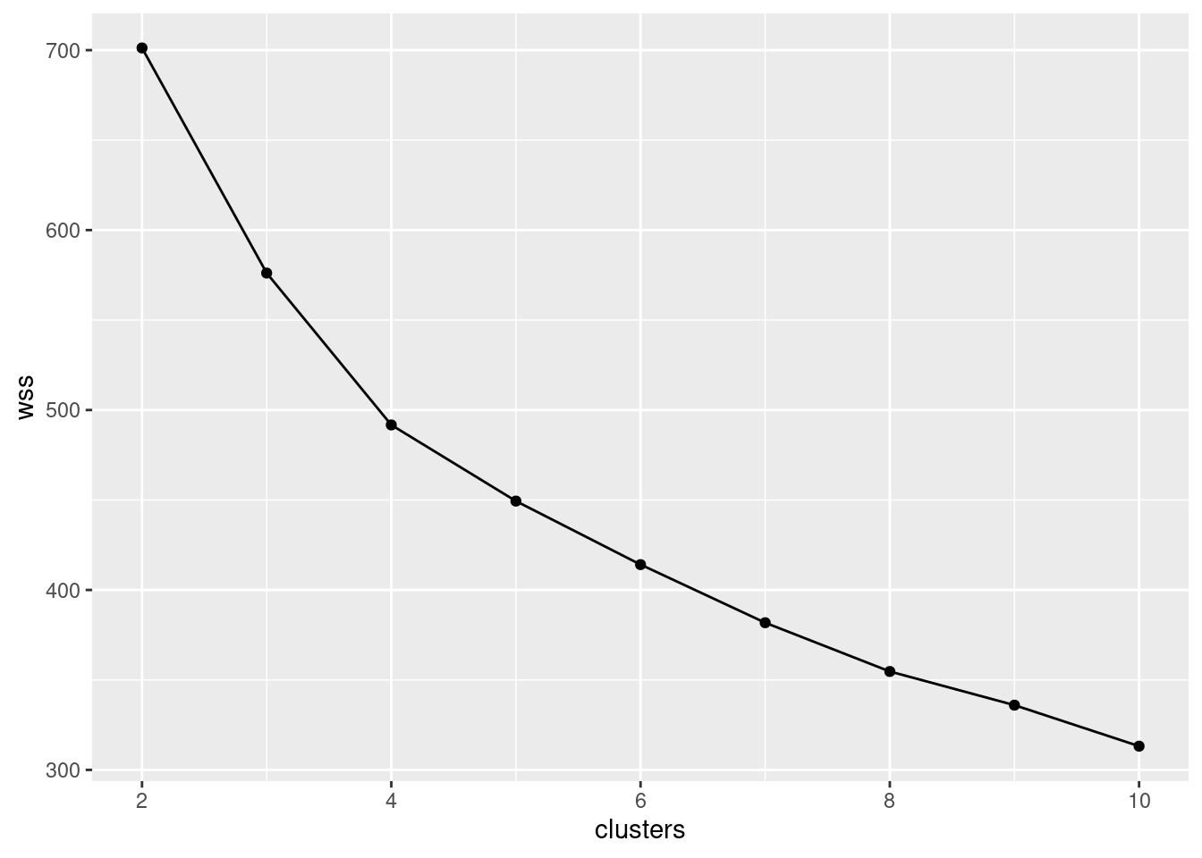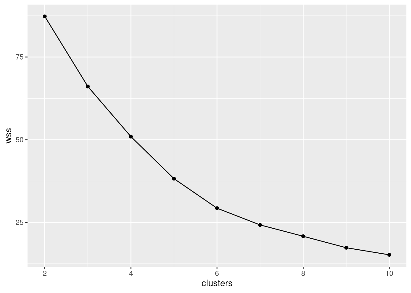 statuscolumn!)We are going to make a scree plot. First, calculate the total within-cluster SS for each number of clusters from 2 to 10.