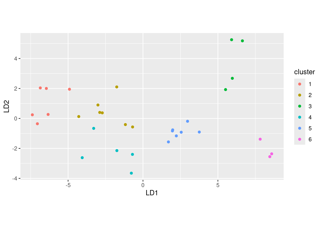 Draw a biplot (which shows the first two LDs), drawing the clusters in different colours. Comment briefly on anything especially consistent or inconsistent with what you’ve seen so far.