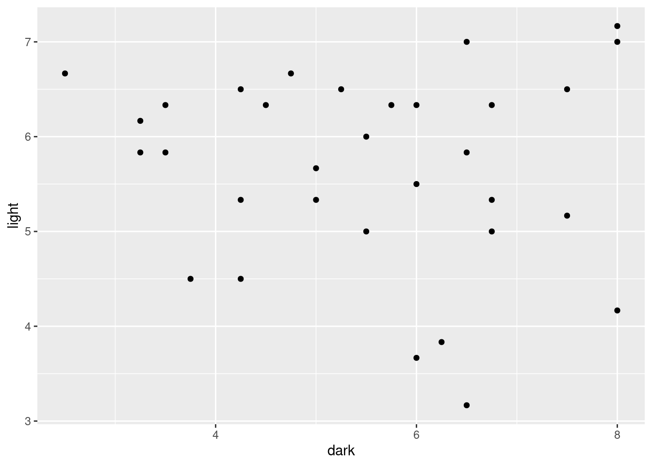 ggplot(aes(x = dark, y = light)) + geom_point()