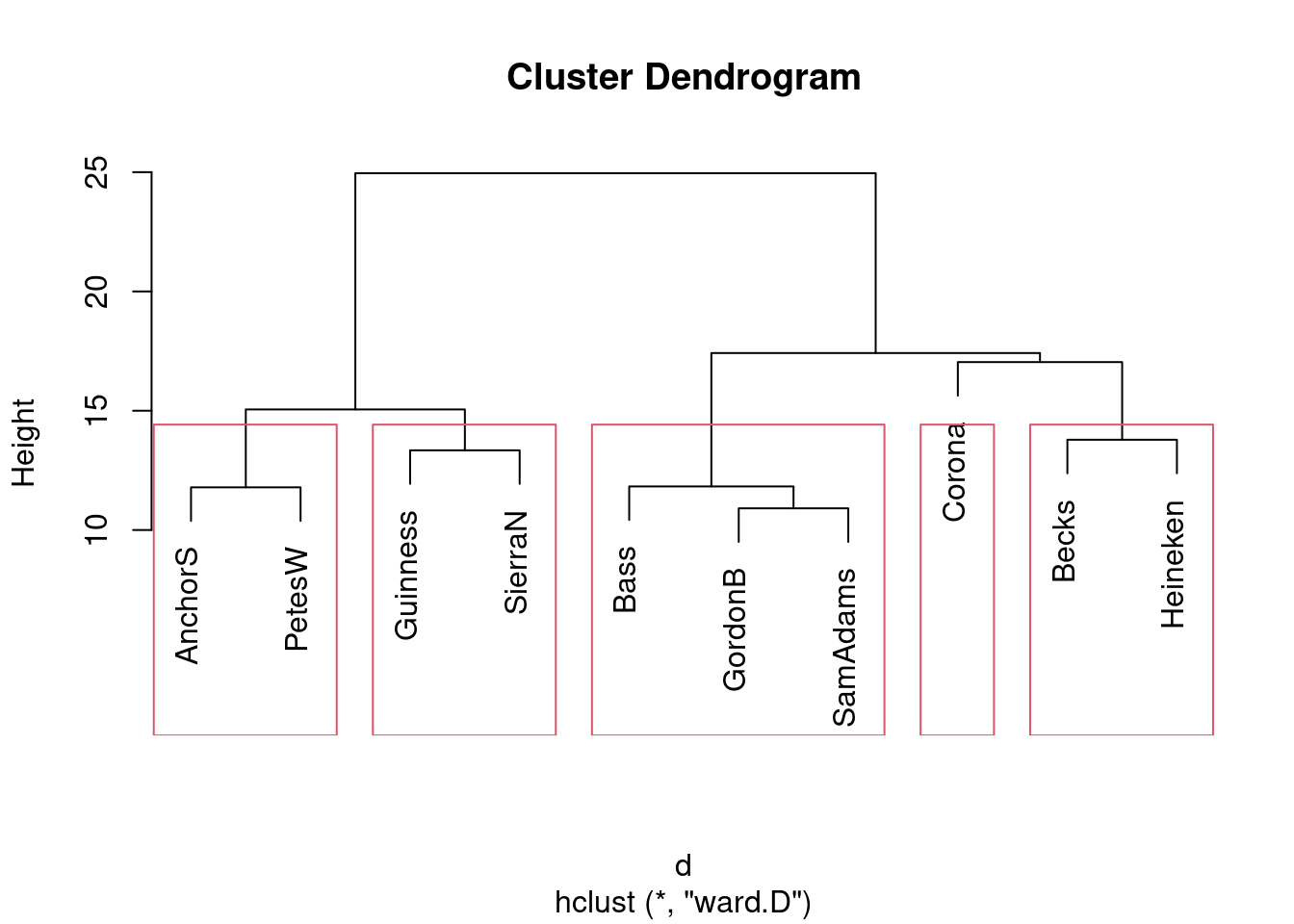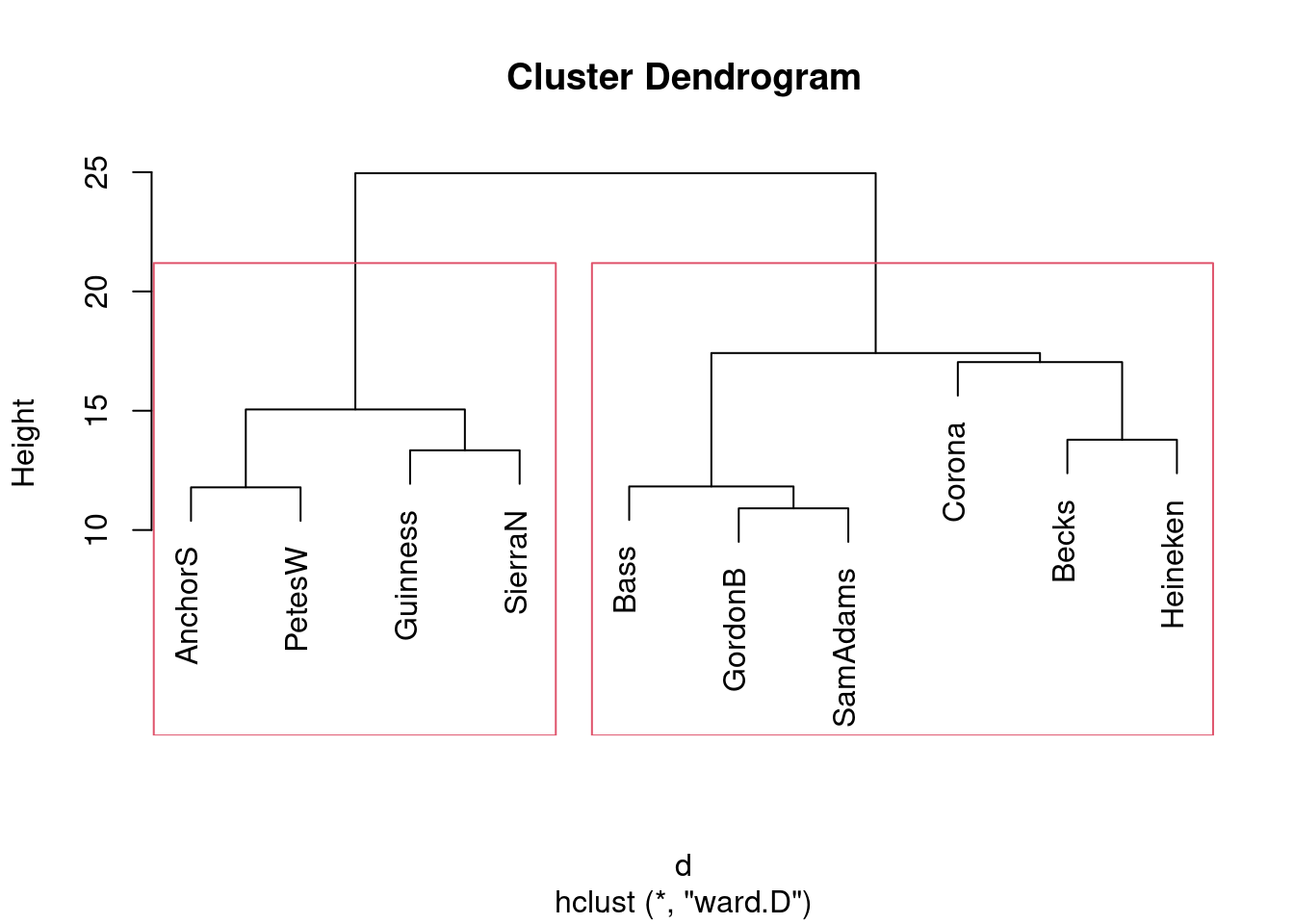 This is a judgement call. Almost anything sensible is reasonable. I personally think that two clusters is good, beers Anchor Steam, Pete’s Wicked Ale, Guinness and Sierra Nevada in the first, and Bass, Gordon Biersch, Sam Adams, Corona, Beck’s, and Heineken in the second. You could make a case for three clusters, splitting off Corona, Beck’s and Heineken into their own cluster, or even about 5 clusters as Anchor Steam, Pete’s Wicked Ale; Guinness, Sierra Nevada; Bass, Gordon Biersch, Sam Adams; Corona; Beck’s, Heineken.