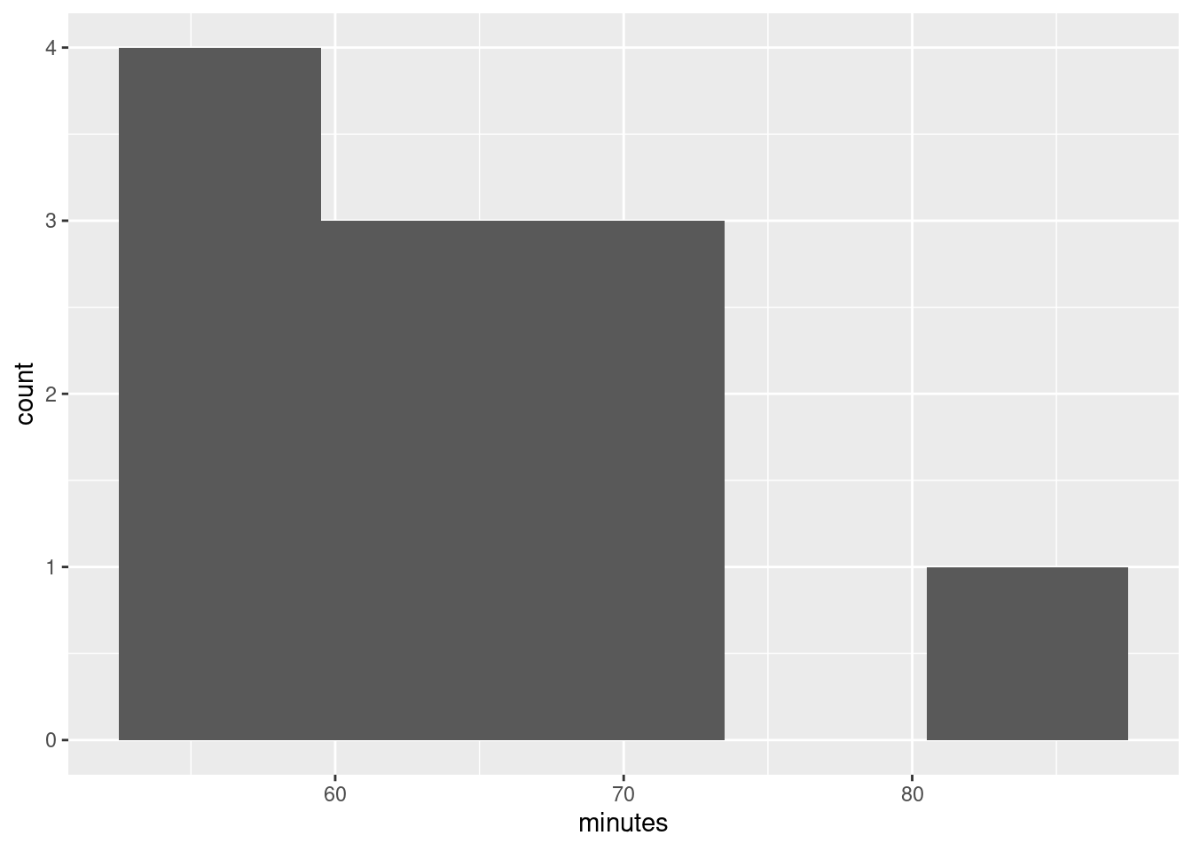 t.test. Orp.value.↩︎Whether you think it is or not may depend on how many bins you have on your histogram. With 5 bins it looks like an outlier, but with 6 it does not. Try it and see.↩︎