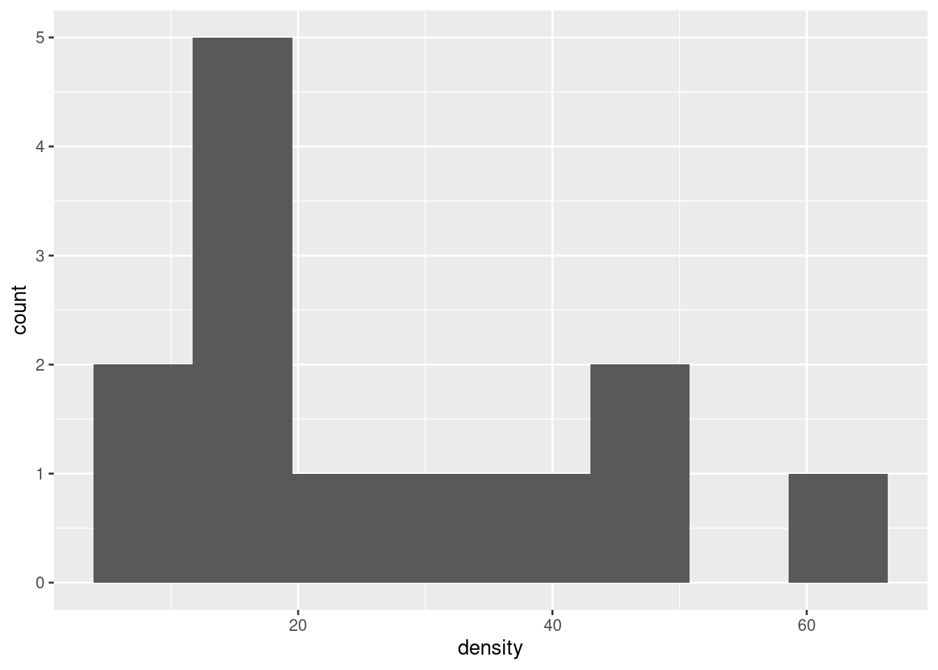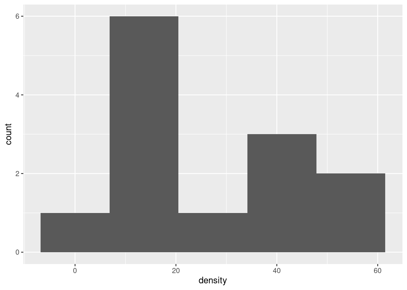 ggplot(societies,aes(x=density))+geom_histogram(bins=5)