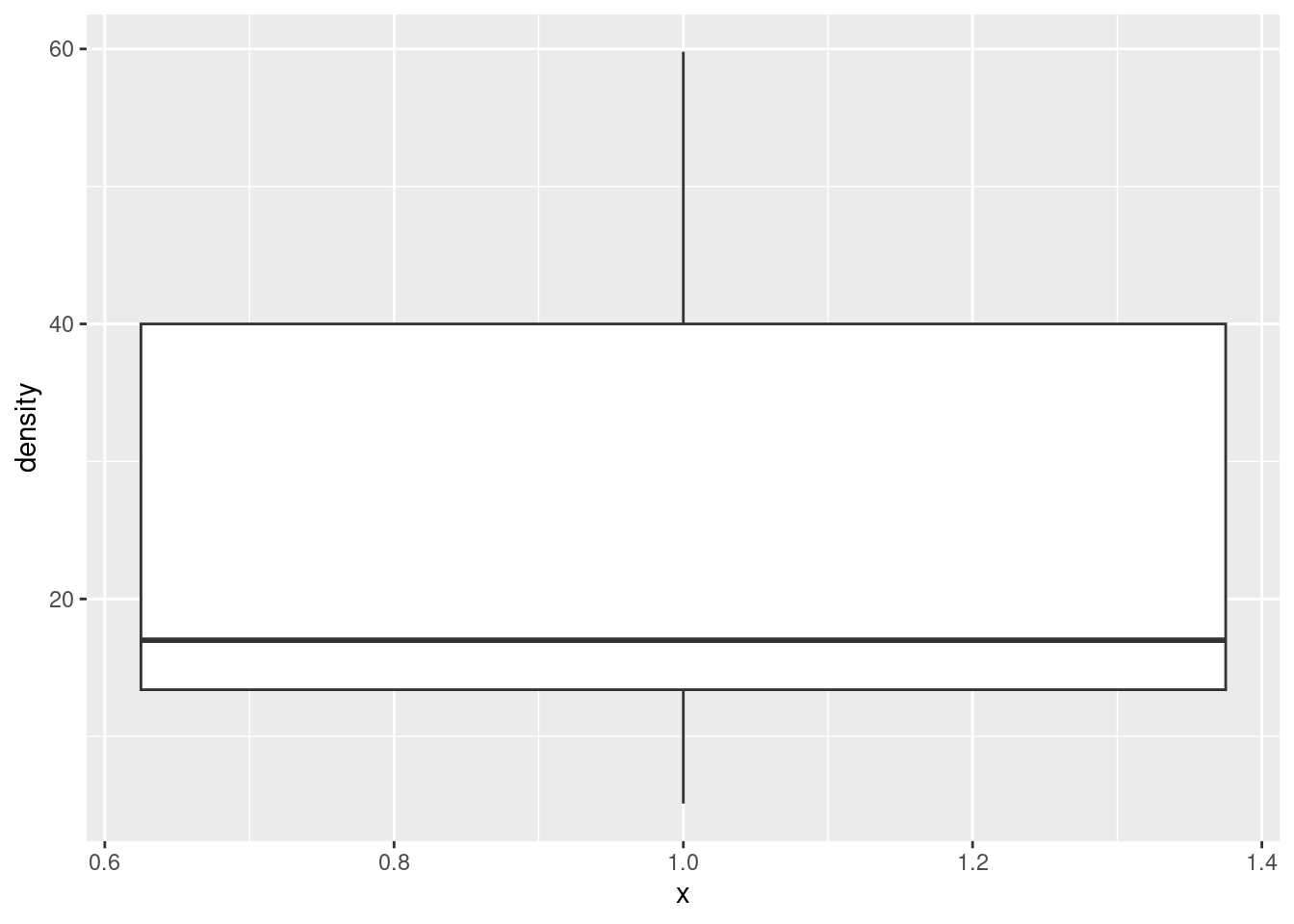 ggplot(societies,aes(x=1,y=density))+geom_boxplot()