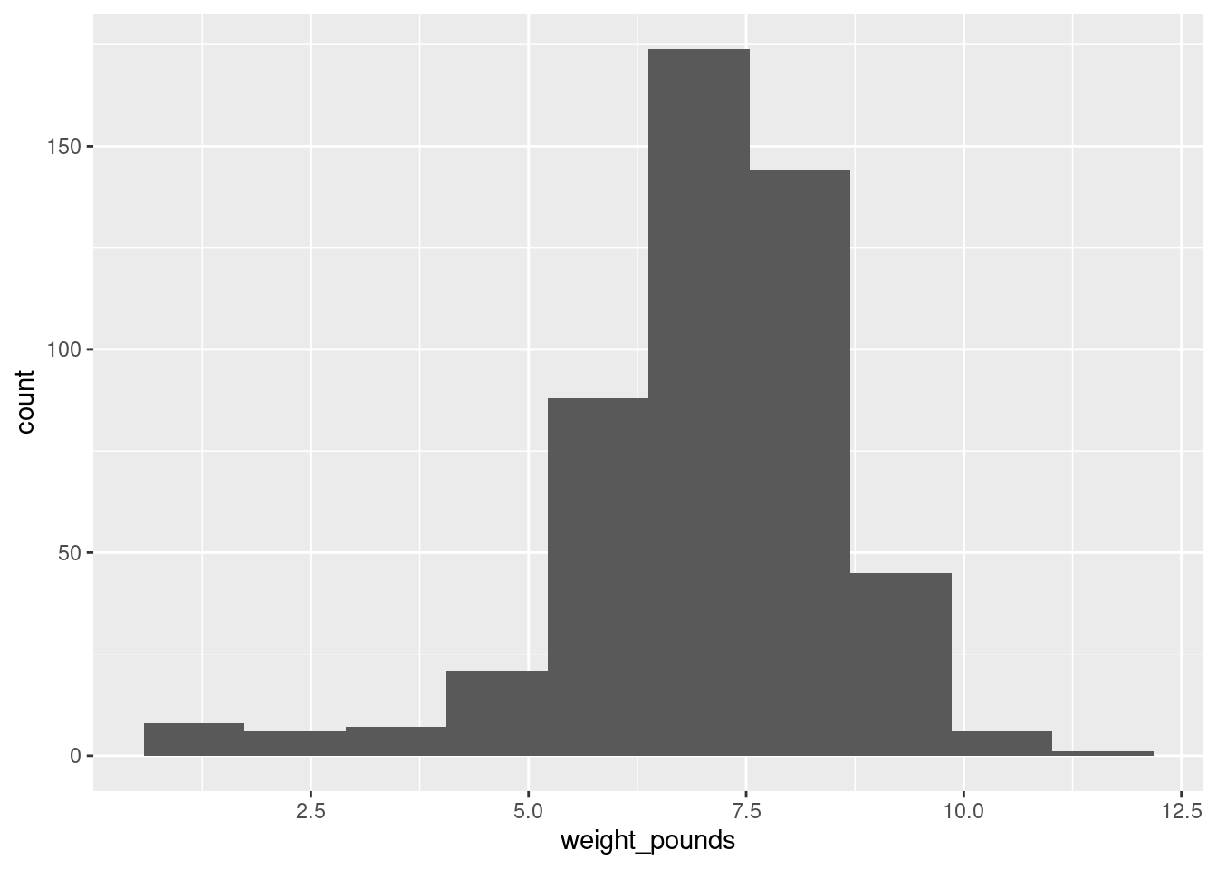 The theory behind the \(t\)-test says that the distribution of birth weights should be (approximately) normally distributed. Obtain a histogram of the birth weights. Does it look approximately normal? Comment briefly. (You’ll have to pick a number of bins for your histogram first. I don’t mind very much what you pick, as long as it’s not obviously too many or too few bins.)