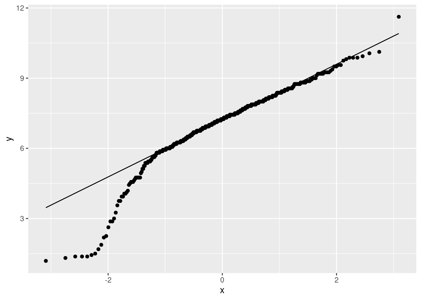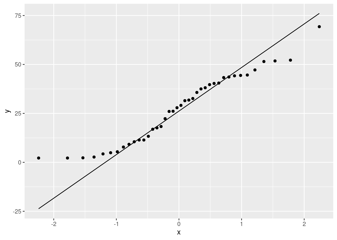 The normal quantile plot is rather interesting: it says that the uppermost values are approximately normal, but the smallest eight or so values are too bunched up to be normal. That is, normality fails not because of the long tail on the right, but the bunching on the left. Still right-skewed, though.↩︎