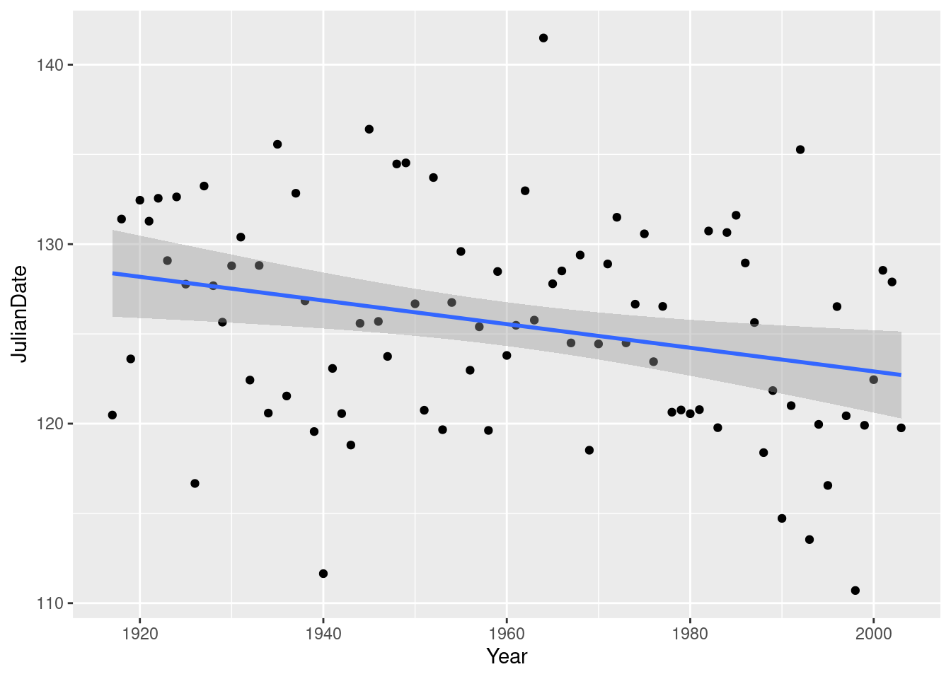 JulianDateagainstYearon a scatterplot. What recent trends, if any, do you see? Comment briefly. (You did this before, but I have some extra comments on the graph this time, so feel free to just read this part.)