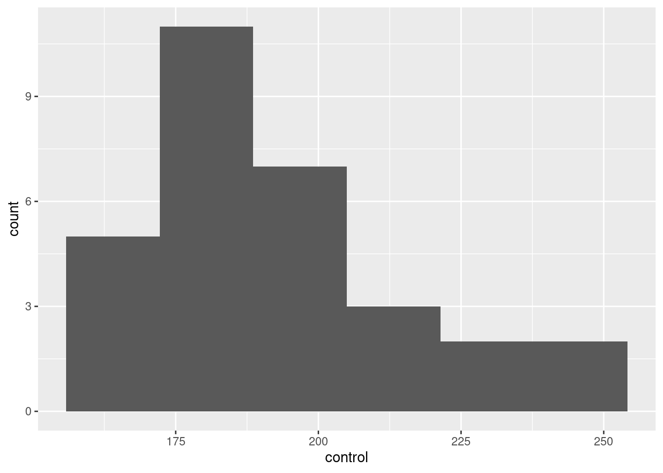 ggplot(cholest, aes(x=control)) + geom_histogram(bins=6)