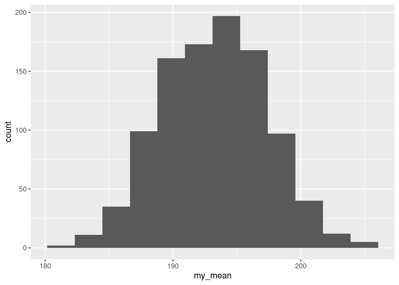 The sample that we had is in some sense an “estimate of the population”. To think about the sampling distribution of the sample mean, we need more estimates of the population. How might we get those? The curious answer is to sample from the sample. This is the idea behind the bootstrap. (This is what Lecture 3c is about.) The name comes from the expression “pulling yourself up by your own bootstraps”, meaning “to begin an enterprise or recover from a setback without any outside help” (from here), something that should be difficult or impossible. How is it possible to understand a sampling distribution with only one sample?