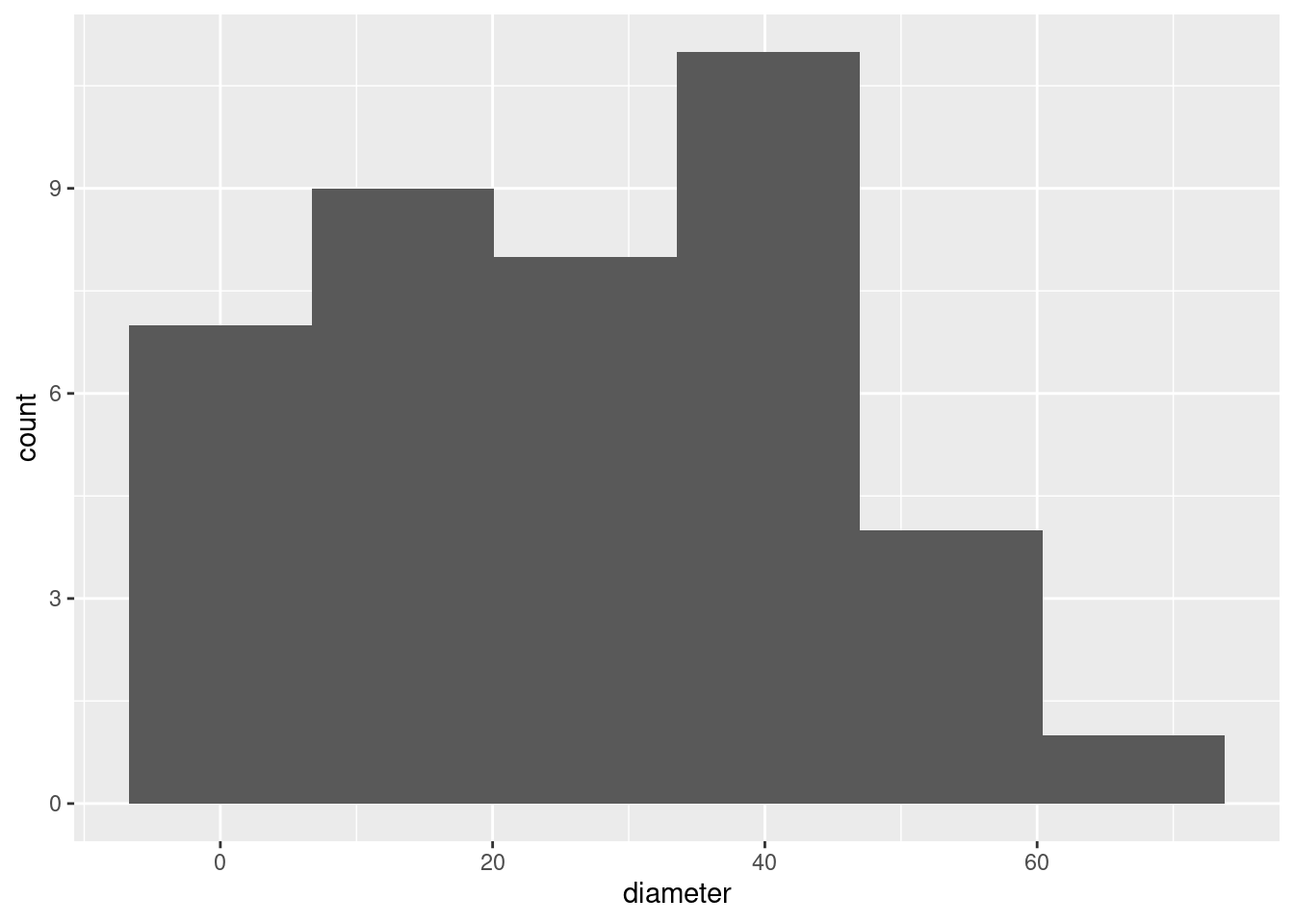 The Wade Tract in Thomas County, Georgia, is an old-growth forest of longleaf pine trees. It has survived in a relatively undisturbed state since before settlements of the area by Europeans. For each tree in the tract, researchers measured the diameter at breast height. This is a standard measure in forestry: it is defined as the diameter of the tree at 4.5 feet above the ground.1 They are interested in the mean diameter at breast height of the trees in this tract. These values are in http://ritsokiguess.site/datafiles/treediameter.csv. The diameters are measured in centimetres. The easiest way to get the URL is to right-click on the blue text and select Copy URL. (If you copy and paste the actual text you might end up with extra spaces, especially if the printed URL goes over two lines.)