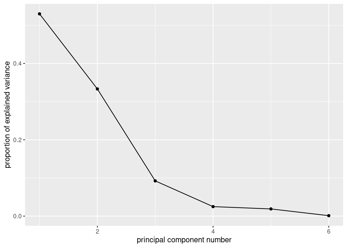 I see elbows at 3 and at 4. Remember you want to be on the mountain for these, not on the scree, so this suggests 2 or 3 components, which is exactly what we got from looking at the standard deviations and cumulative variance explained.