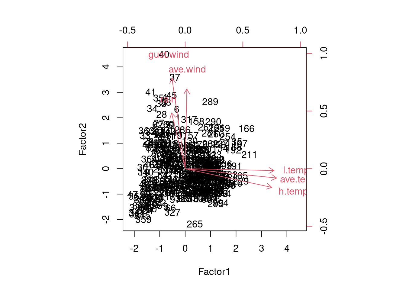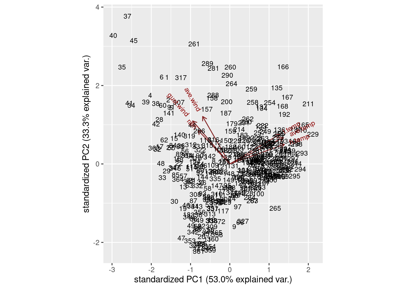 d %>% arrange(Comp.1)Day 40 has the lowest component 1 score. This is one of the cooler days. Also, there is a largish amount of rain and wind. So low temperature, high rain and wind. Some of the other days on my list were cooler than day 4, but they had less rain and less wind.