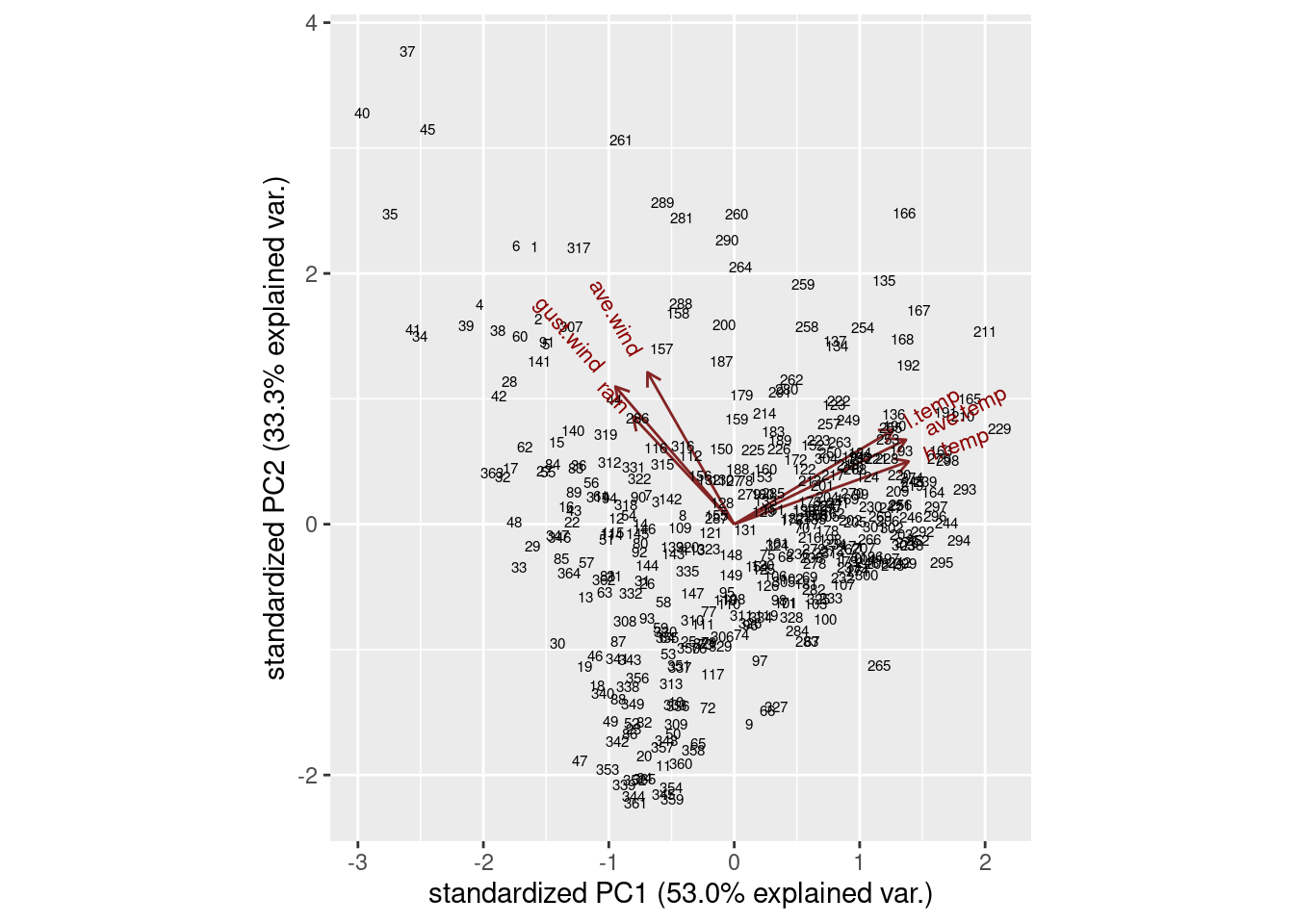 - Make a biplot of these data, labelling the days by the day count (from 1 to 365). You may have to get the day count from the original data frame that you read in from the file. You can shrink the day numbers to make them overwrite each other (a bit) less.