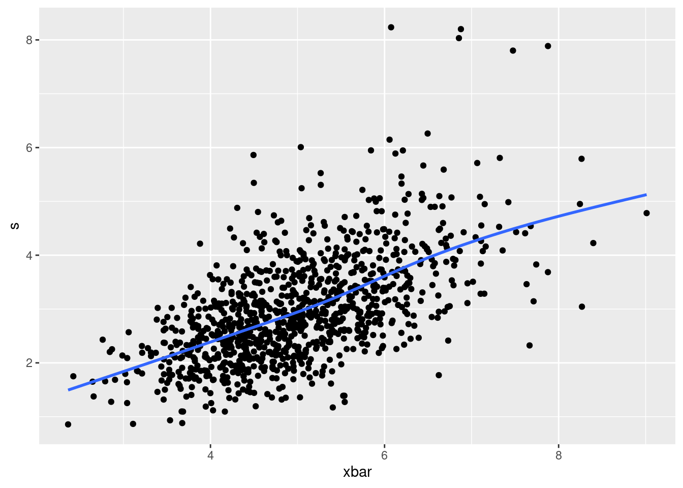 ggplot(mean_sd, aes(x=xbar, y=s)) + geom_point() + geom_smooth(se=F)`geom_smooth()` using method = 'gam' and formula = 'y ~ s(x, bs = "cs")'