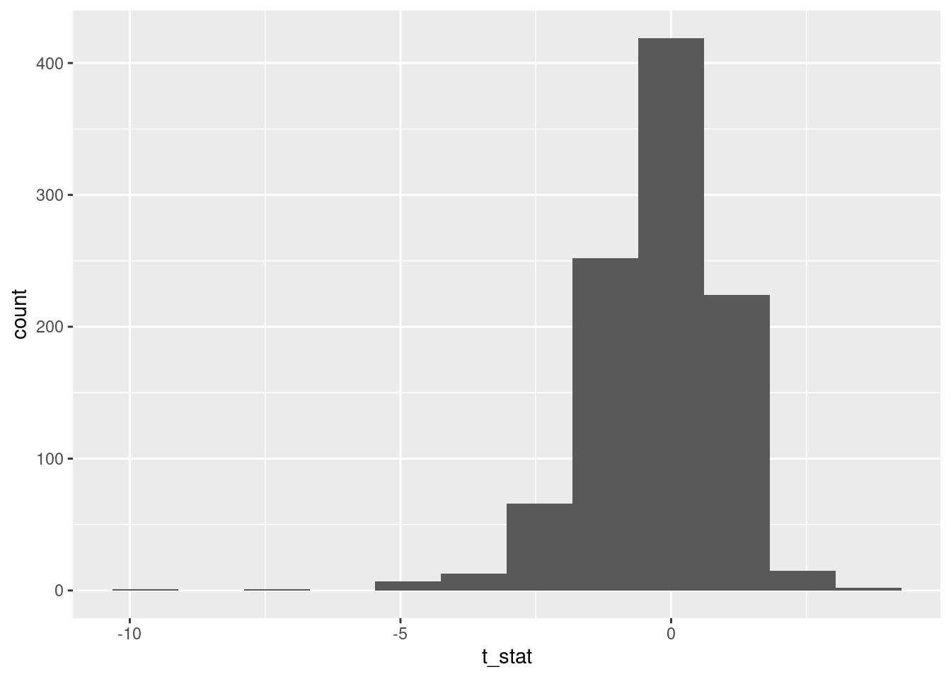mean_sdAs for coding, I made a dataframe with a column sim that numbers the individual samples, made sure I said that I wanted to work rowwise, generated a random sample from the population in each row of size 10, and found its mean, SD and the calculated-by-me \(t\)-statistic.8