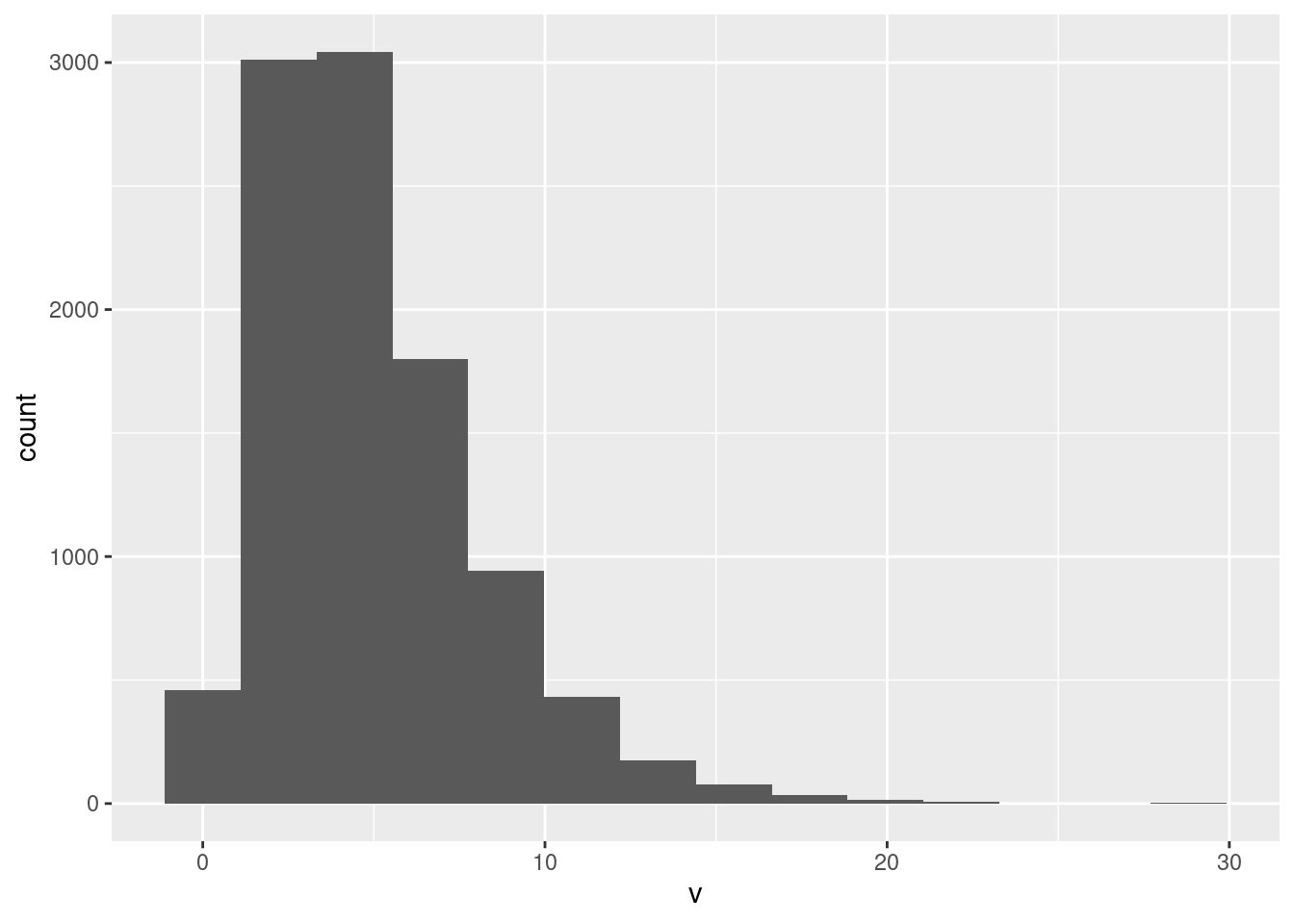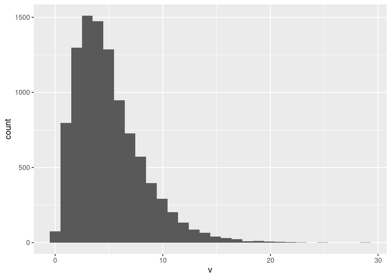 ggplot(pop, aes(x=v)) + geom_histogram()`stat_bin()` using `bins = 30`. Pick better value with `binwidth`.