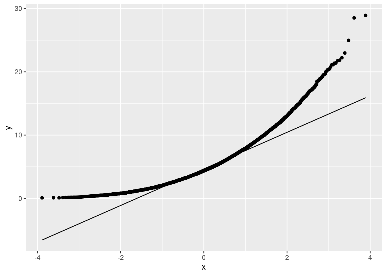 ggplot(pop, aes(sample=v)) + stat_qq() + stat_qq_line()