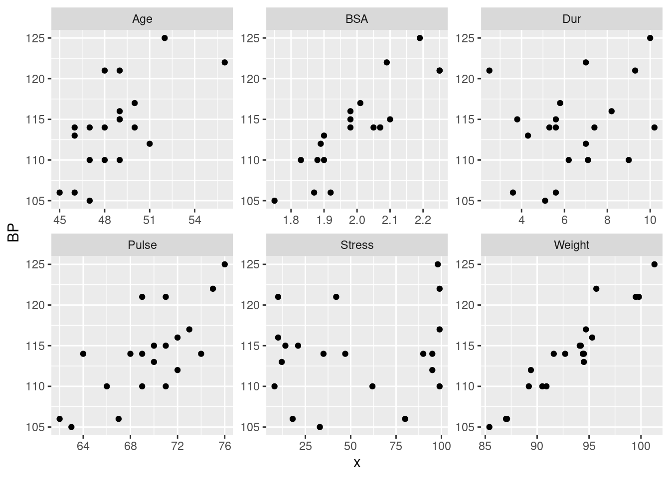 Pt: patient number (ignore)BP: (diastolic) blood pressure, in mmHgAgein yearsWeightin kgBSA: body surface area, in m\(^2\)Dur: length of time since diagnosis of high blood pressure, in yearsPulse: pulse rate, in beats per minuteStress: score on a questionnaire about stress levels (higher score is more stressed)
