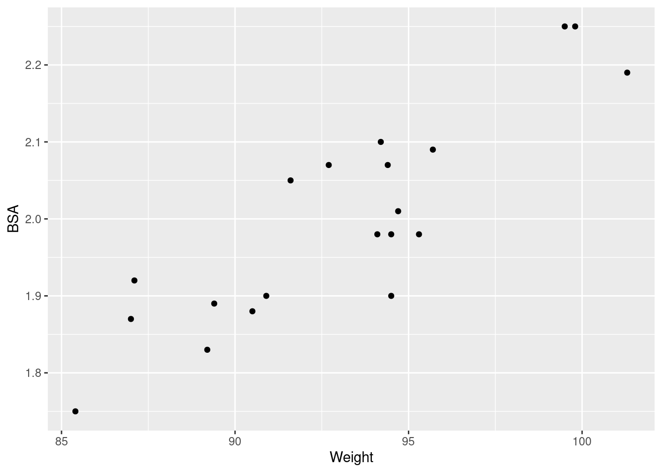 The other thing is that the correlation between Weight and BSA is the highest of all the correlations between variables that are not the response. So if you know a person’s weight, you can already make a good guess at their body surface area, even without having the actual values. Hence, including BSA in the regression when you already have Weight is not very helpful.