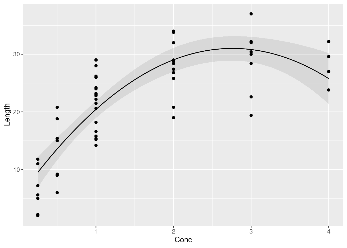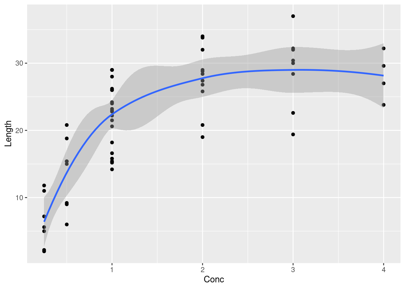 ggplot(muscle, aes(x = Conc, y = Length)) + geom_point() + geom_smooth()`geom_smooth()` using method = 'loess' and formula = 'y ~ x'